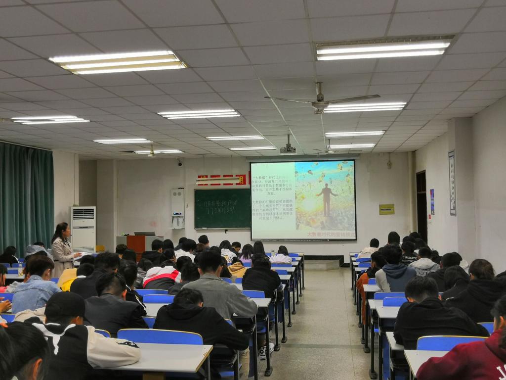 2019年10月16日,商学院赵荣副教授在致真楼1102教室举办主题为《大数据时代的营销模式》的学术讲座。本次学术讲座由商学院营销外贸系市场营销教研室主办,市场营销协会协办。市场营销协会成员及18级、19级市场营销,18级电子商务共140余名同学参加了本次学术讲座。