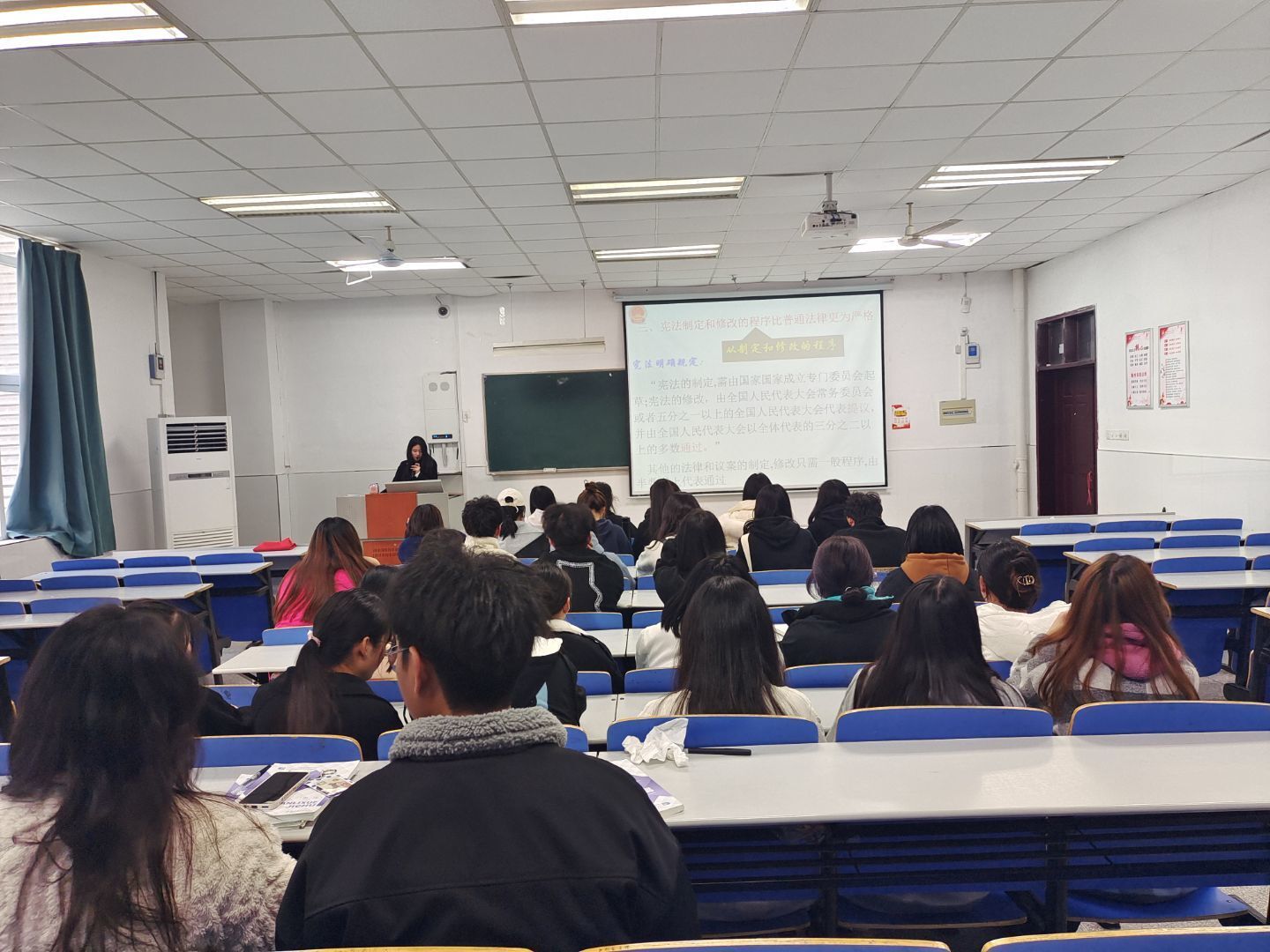 本次活动围绕“宪法”、“爱国”两个主题。活动开始,由杨燕带领同学们学习了解宪法的主要内容和重要地位。接着通过问答题的方式,让同学们加深巩固宪法相关知识。随后各班团支书以团支部为单位分别开展了学宪法相关活动,既增加了活动的丰富性与趣味性,又加深了同学们对宪法的理解和领悟。