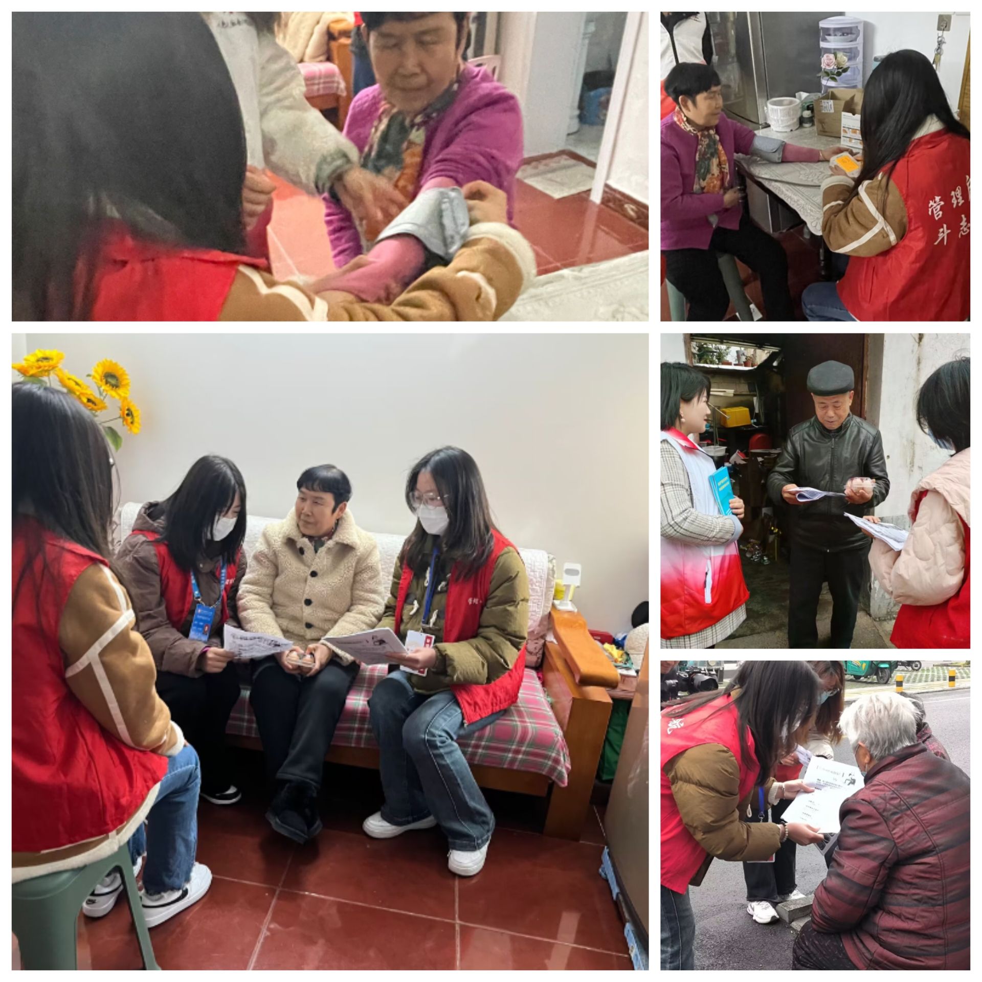 活动开始,社区工作人员带领志愿者们一户户上门为居民们测量血压,志愿者们仔细的询问、测量和记录相关信息。再针对大部分老人血压偏高的现象,耐心为他们讲解高血压的危害以及如何预防高血压,并建议大家要合理膳食、戒烟戒酒、适量运动、定期测量血压、保持良好心态等。同学们在测量血压过程中加深了对雷锋精神内涵的理解。