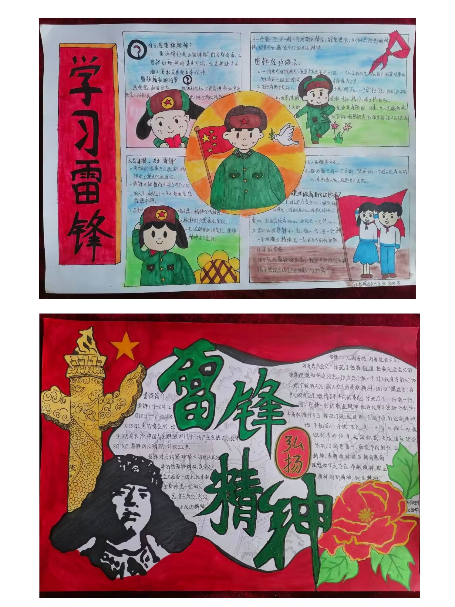 各班积极组织参赛,学生以图文并茂的形式,说雷锋故事、讲雷锋事迹、树雷锋精神。从各个方面再现雷锋故事和自己身边的助人为乐的好人好事。共选出6幅制作精美、内容丰富、形式饱满的作品参加展览。