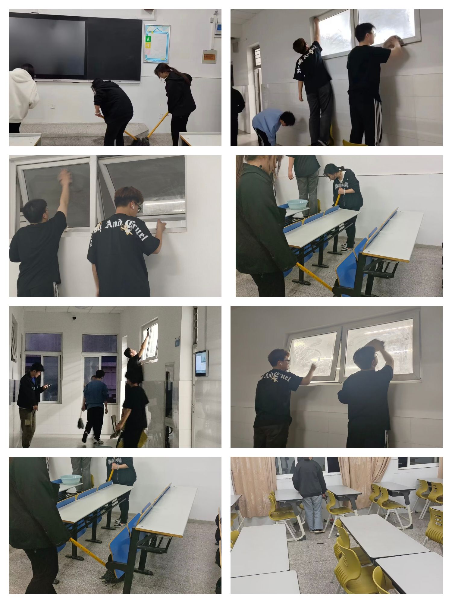 在五一劳动节即将来临之际,为进一步营造整洁、优美、文明、卫生的校园环境,2023年4月27日,管理学院学生会组织全体大一学生在一号楼和四号楼开展教室卫生大扫除活动。