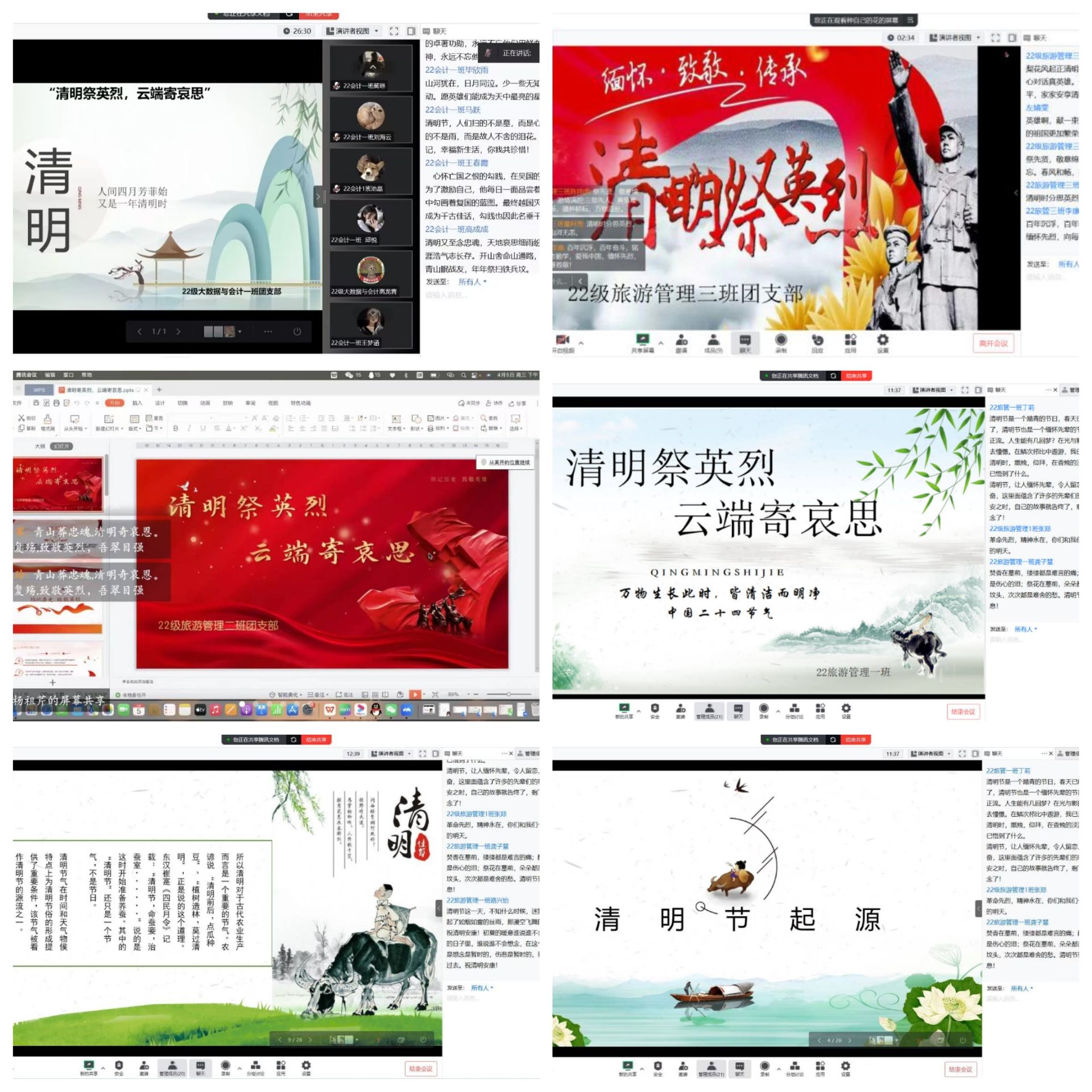 本次活动由各班团支书主持,通过腾讯会议向大家讲解清明节的由来、先烈们的英雌事迹,促使同学们了解祖国悠久的历史、灿烂的文化,增强民族自豪感并且向大家传递一种无私奉献的精神和忠贞不渝的爱国情怀。在活动的最后同学们在这肃穆的气氛中为烈士们默哀一分钟,以表达对烈士的缅怀。