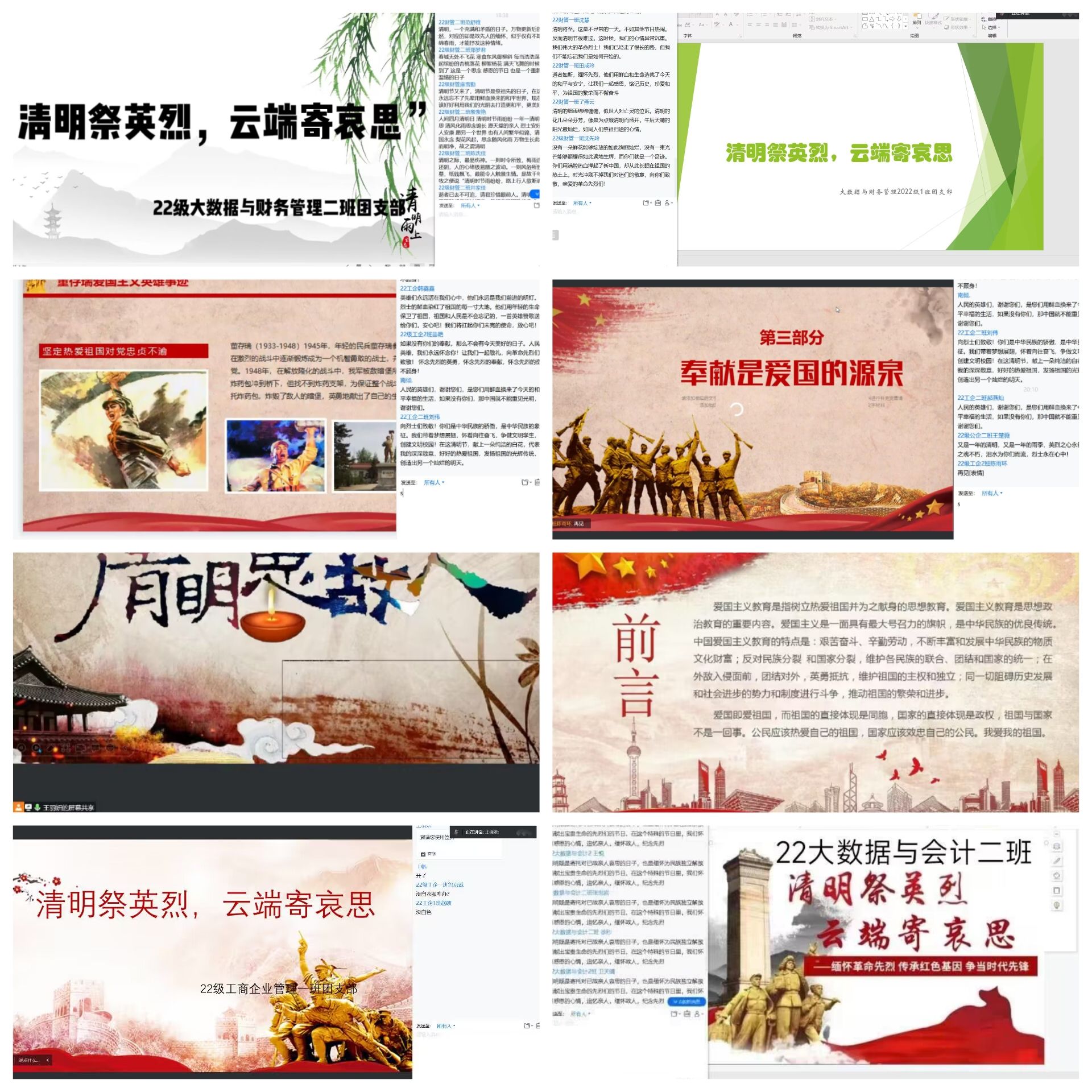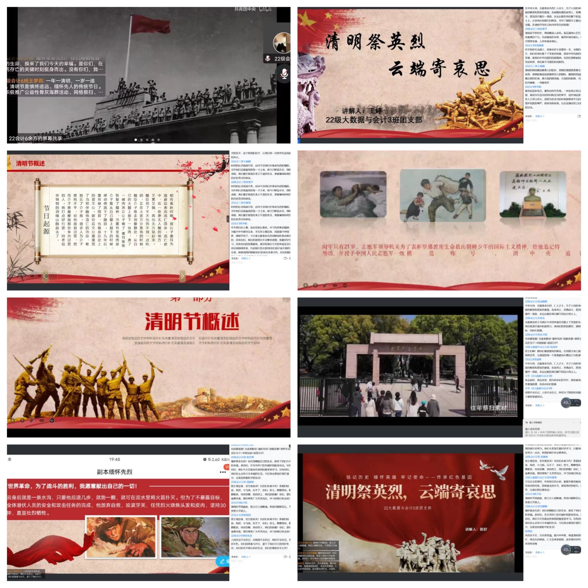 为弘扬民族精神,缅怀革命先烈,加强对同学们的革命传统教育,培养同学们的思想道德素质,管理学院团总支于2023年4月5日举行“清明祭先烈,云端祭英烈”活动,管理学院22级各班团支部成员参加。