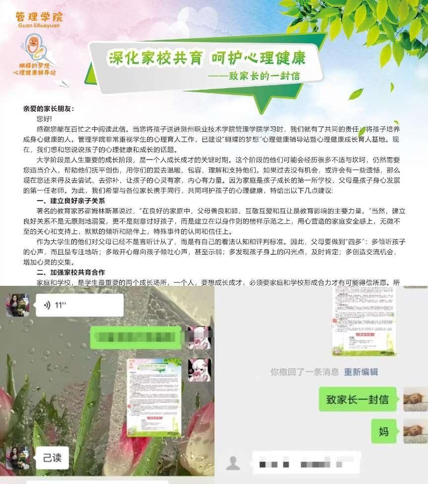 著名的教育家苏霍姆林斯基说过,“在良好的家庭中,父母善良和睦、互敬互爱和互让是教育影响的主要力量。大学阶段是每个学生人生重要的成长阶段,在这个阶段的大学生可能会经历很多不适与坎坷,仍然需要家长介入,和学校一起努力,共同呵护学生的健康成长。所以,“蝴蝶的梦想”心理健康辅导站希望通过这封信增强家长对学生心理的关注,对学院心理育人工作的重视,以增强家校协同育人合力。