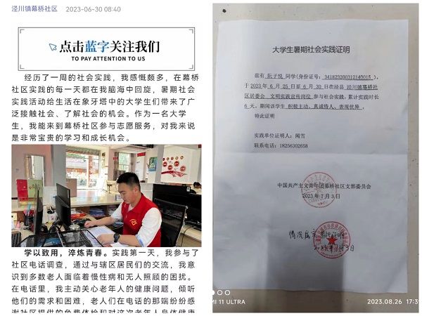22机电3班阮子悦同学秉持着“奔赴火热实践,绽放绚丽之花”的青春主题,于6月25~30日参加了泾县泾川镇幕桥社区的文明实践宣传岗位,主要从事社区电话调查、宣传手册宣发、“爱我泾川——烟头革命”等志愿服务工作,并被该社区进行了专题报道,既锻炼了实践能力,也增强了社会责任感和服务意识。