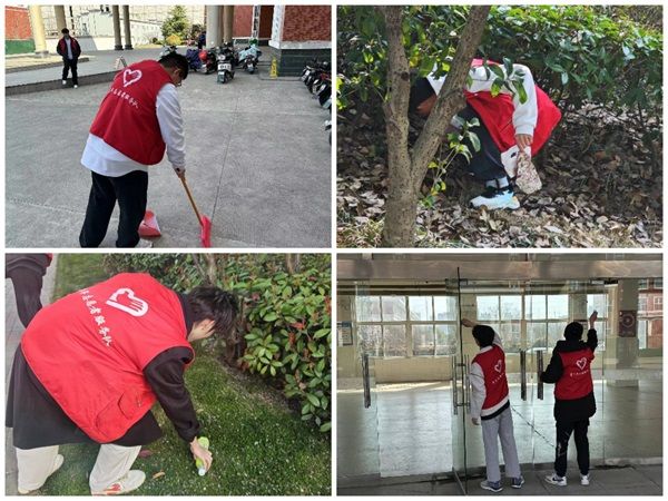 大家分工明确,有条不紊地展开清洁工作,有的手持夹子捡拾垃圾;有的挥舞扫帚,将落叶和尘埃聚集;有的戴上手套,将杂草清理;有的团队合作,将杂乱的电动车摆放整齐。他们不怕脏、不怕累,干劲十足,认真细致地将每个角落进行打扫,为营造干净整洁的校园环境增添了一抹耀眼的志愿“红”。