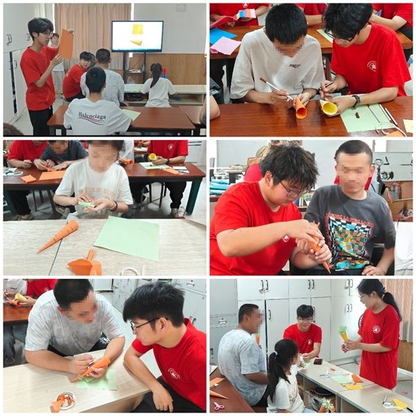在手工劳动方面,志愿者教授星星孩子们制作简单的折纸、剪纸作品,将一张张板正的纸张裁剪成形象鲜明的胡萝卜,不仅提升了动手实践能力,还进一步提升增强了平衡协调、团结合作、自我效能感等认知功能。