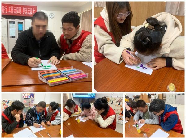 志愿者先和孩子们一起观看了关于交通安全的动画视频,并互动问答,让孤独症儿童深入了解了交通安全知识。紧接着,志愿者们与孩子们携手共绘,一幅幅色彩斑斓、充满想象力的画作在孩子们的笔下悄然绽放。随后,志愿者与孩子们玩起了拼音游戏,志愿者们首先向孩子们介绍了拼音的基础知识,通过拼音读板、拼音卡牌和拼音方块的游戏化方式,与孩子们玩起了读拼游戏,以此引导他们学习拼音的发音和拼写。