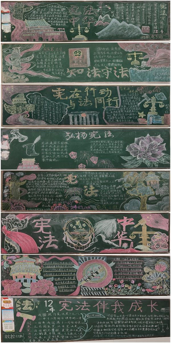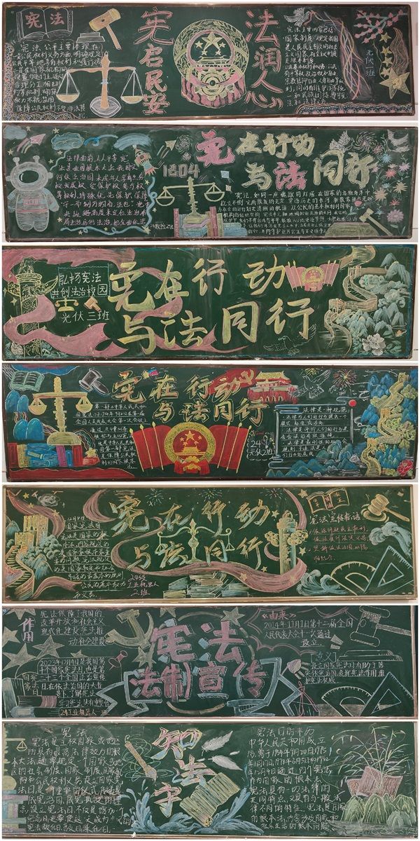 活动期间,各班团支部成员围绕“宪启·智明·行正”的主题,深入挖掘宪法内涵,结合校园生活与社会热点,精心构思、设计并绘制了内容丰富、形式多样的黑板报。他们以宪法为启蒙之光,点亮智慧明灯,引领同学们在宪法知识的海洋中遨游,不断汲取法治精神的养分。同时,他们通过生动的漫画形象以及创意标语等形式,将宪法赋予公民的基本权利与义务、宪法的基本原则与国家机构的设置等知识点巧妙融入其中,使黑板报既具有教育意义,又富有吸引力,激发了同学们学习宪法的热情与兴趣。