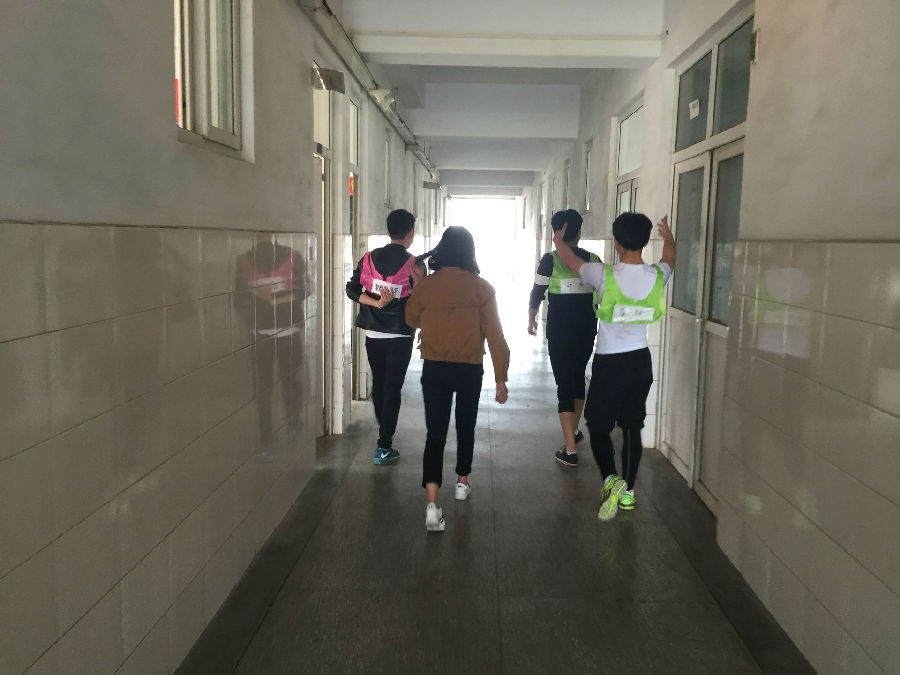 此次游戏分为两部分,第一部分是同学们通过小游戏的优胜赢得积分,获得优先进场权;第二部份是各组在特定的区域内寻找7张卡片,这期间,每组队员要相互协作,保护好自己的名牌,被撕即淘汰,找齐7张卡片的队伍获胜。2:30同学们齐聚技师学院操场,根据提前选好的分组,各自组成1, 2, 3, 4,5组,并贴上写有自己名字的名牌.五个小组先后进行了“绑腿跑”、“引导走迷宫”的较量,最后3组获得优先进场权。