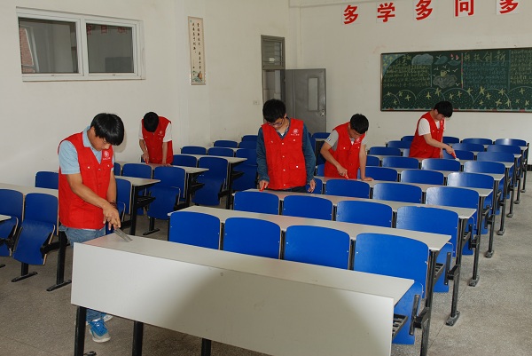 经过合理分工,大家便积极投入到本次活动中。干事们纷纷拿起抹布、扫帚、拖把等清洁工具对教室的门窗、黑板、桌椅、地面以及各个卫生死角进行彻底的清理和打扫。有的埋头苦干,有的相互配合共同“铲除”课桌文化。活动过程中,大家相互配合,不怕脏、不怕累,共同为教室美化出一份力。经过历时近1个小时的细致打扫,105教室都窗明几净,焕然一新,整洁有序。