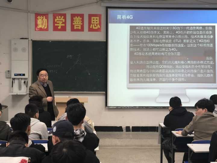 2019年4月10日,滁州城市职业技术学院党委委员、纪委书记程一斌同志在机电工程系5102多媒体教室举办学术讲座。讲座的题目是:1G到5G通信技术,机电工程系机电一体化、电气自动化、工业机器人专业120余名学生聆听了报告。讲座围绕前几代通信技术、5G简介、5G关键技术介绍了各代通信技术的特点特征、关键技术,详细阐述了通信技术随着电子技术和计算机网络技术的发展历程和实际应用。他结合手机应用得变化,理论联系实际,以案释义,深入浅出,为同学们做了一场生动精彩的学术讲座。