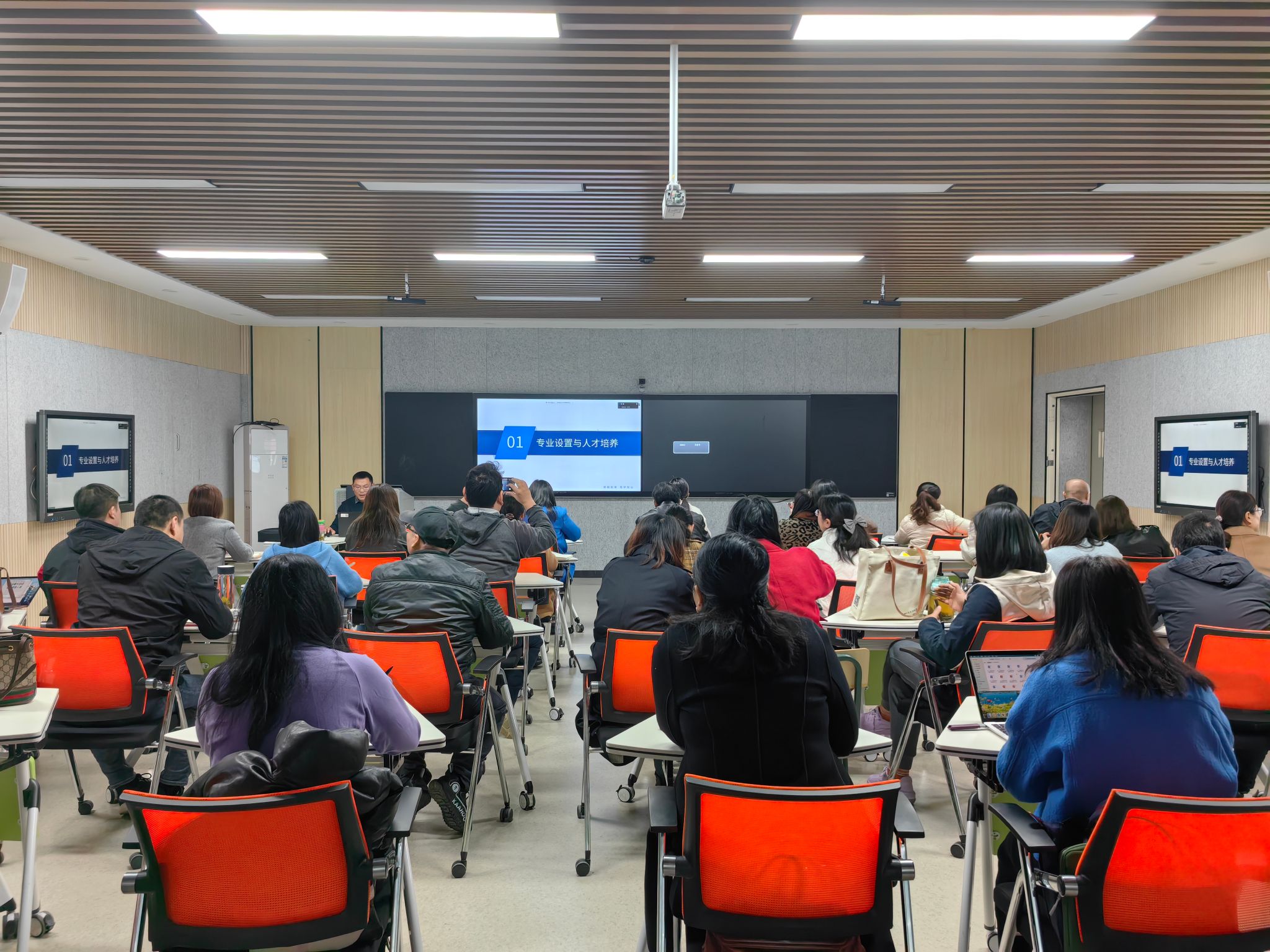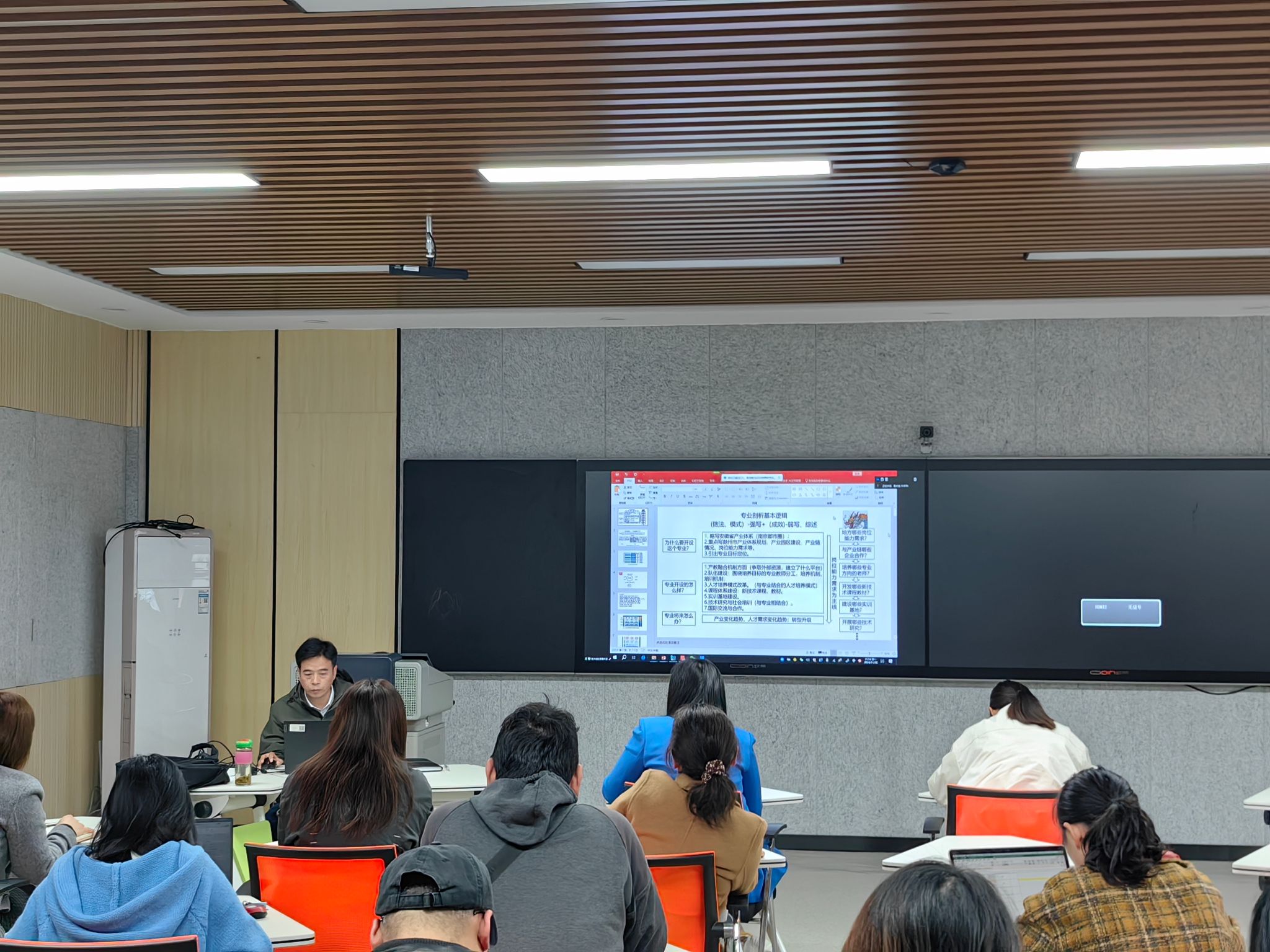 蒋庆斌教授认真听取汇报后,充分肯定了报告中呈现的专业亮点,同时对存在的问题进行了深入剖析,提出了针对性的改进建议。随后,他以“如何做好专业剖析,服务区域经济与产业发展”为主题,从专业剖析基本逻辑、区域产业重点发展方向、产业对接的人才技术需求等方面进行了全面讲解。他还围绕人才培养模式创新、课程体系优化、优质新形态教材开发、高水平“双师型”教师队伍建设、产教融合实训基地打造以及数字化教学新生态构建等重点内容展开了讲解,为各专业负责人梳理了专业剖析思路,明确了专业建设与发展的方向。