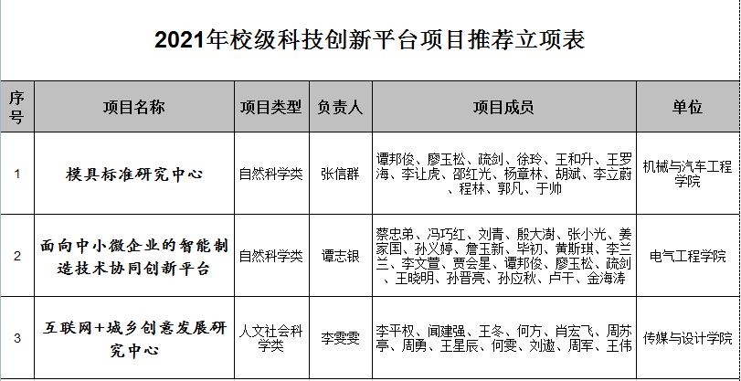 2021年度校级科技创新平台项目的立项工作,经科技处组织校外专家评审,校学术委员会审议,现把推荐立项结果予公示,公示期:2022年3月18日-3月23,如有异议,请以书面形式发科技处工作邮箱kejichu@chzc.edu.cn。