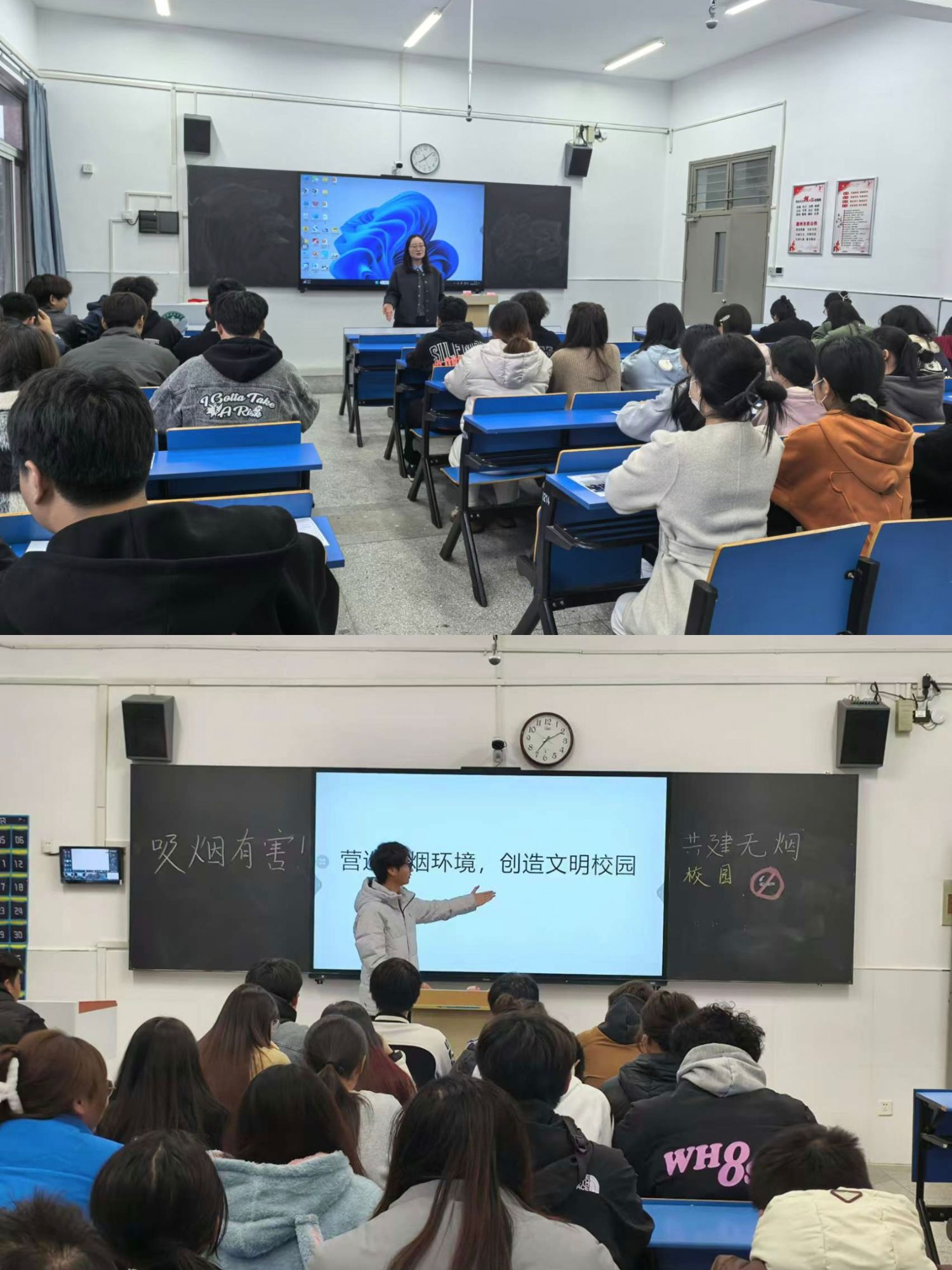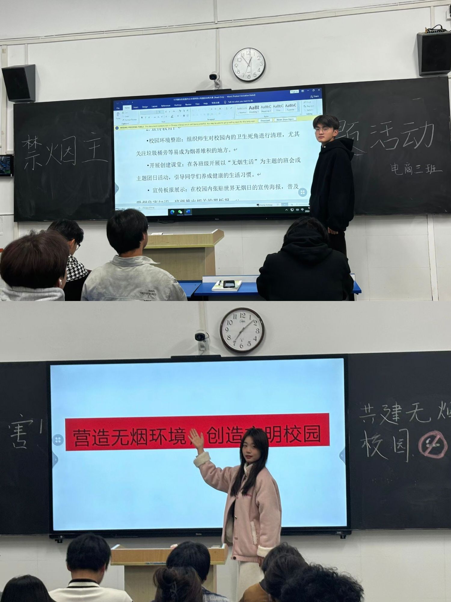 各班级利用晚自习开展以“无烟生活”为主题的班会或主题团日活动,引导同学们养成健康的生活习惯。班会上,辅导员、各位班长通过图片、数据等形式,向同学们展示了吸烟对身体健康的严重危害,包括引发各种疾病、影响呼吸系统等。随后,还介绍了二手烟对他人造成的不良影响,并向身边的人宣传吸烟的危害。同学们也都积极发言,分享了自己对吸烟的看法和认识,要从自身做起拒绝吸烟。同时商学院在校园内张贴世界无烟日的宣传海报,普及吸烟危害知识,班级推出相关的黑板报。