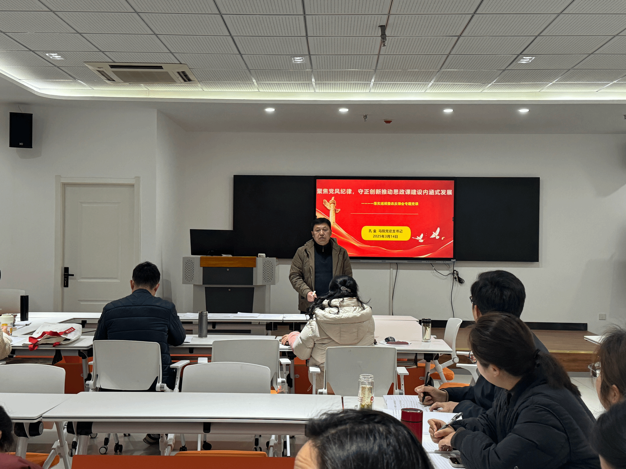为深入学习贯彻党的二十大和二十届二中、三中全会精神,贯彻落实二十届中央纪委四次全会精神,3月14日,马克思主义学院党总支书记孔金在“大思政课”数字研学中心召开“聚焦党风纪律,守正创新推动思政课建设内涵式发展——落实巡视整改反馈会专题党课”,马克思主义学院党总支全体党员参会。