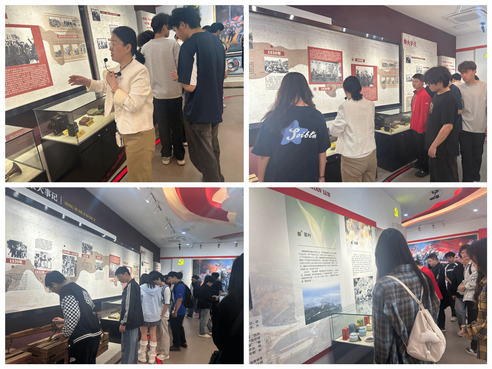 第四站来到施集镇党性教育馆,场馆共设新思想、永传承、谋发展、守初心四个板块。从革命战争时期老一辈英雄们的英勇奋斗,到社会主义建设时期的艰苦创业,再到新时代的伟大征程,每一个历史阶段都被生动地呈现。馆内还单独设有专门的茶文化专区和本地村企联建项目专区,同学们在接受党性教育、感悟红色精神的同时,在这里还了解了井楠茶产业的发展史。