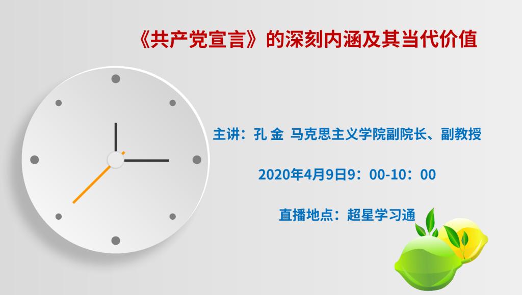 4月9日,马克思主义学院思政理论课教师孔金副教授与2018级学生相约“超星学习通”,在线直播学术讲座“《共产党宣言》的深刻内涵及其当代价值”,举行了一场别开生面的“疫情期间励志思政教育课”。