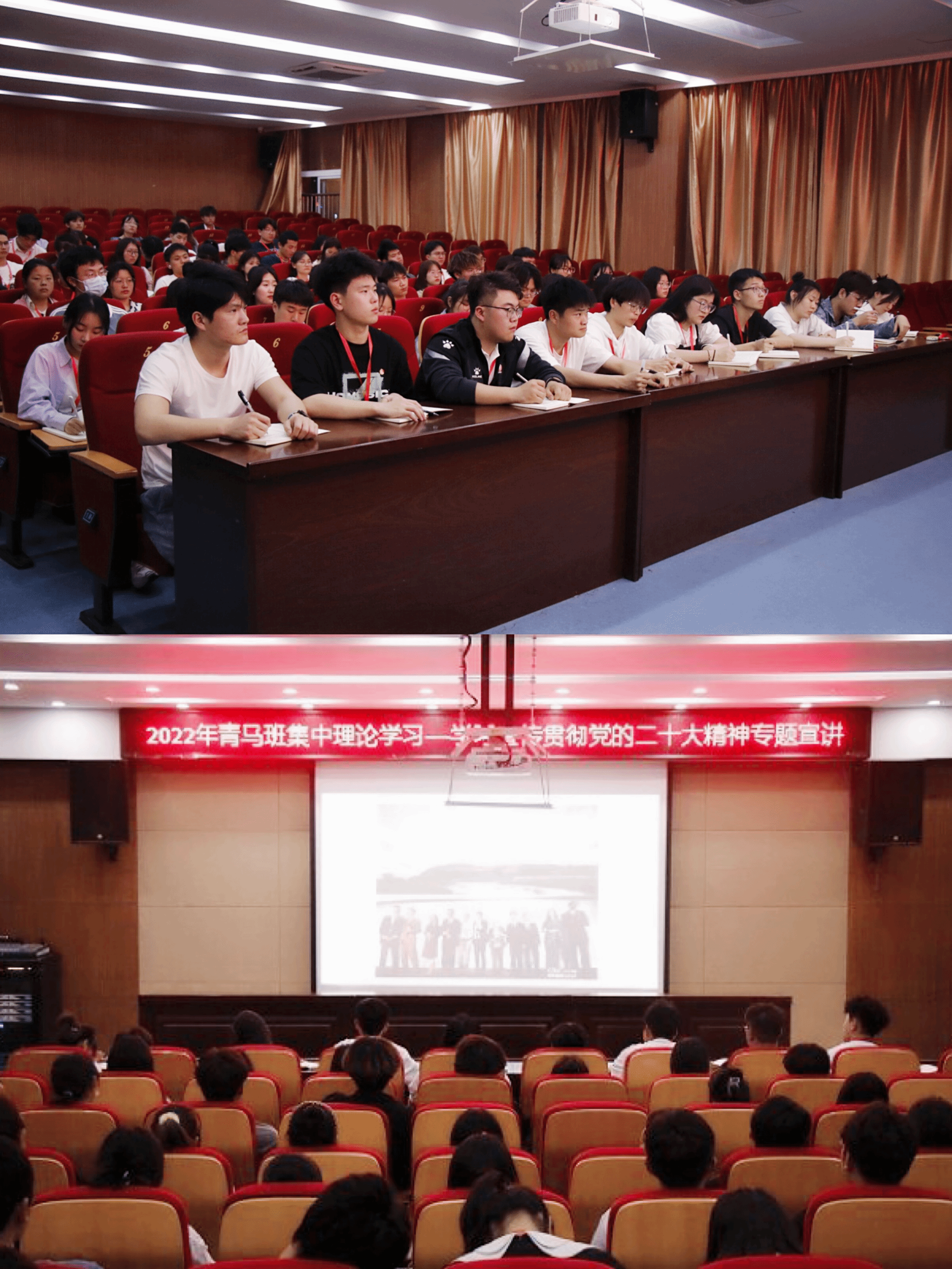 四位老师分别以不同视角、不同的领域进行专题宣讲。马克思主义学院副院长、“马克思主义中国化”教研室主任张家莉围绕“党的二十大报告中的新观点、新论断、新思想”这一主线,从国家过去五年的工作和新时代十年的伟大变革、开辟马克思主义中国化时代化新境界、新时代新征程中国共产党的使命与任务、全面推进中国式现代化四个主题深刻剖析了党的二十大的深刻内涵与精神实质;“思想政治教育”教研室胡颖颖老师以《促进人与自然和谐共生》为题,介绍了习近平总书记在党的二十大报告中所提出的“中国式现代化是人与自然和谐共生的现代化”,向青马学员详细讲述了学习尊重自然、顺应自然、保护自然是全面建设社会主义现代化国家的内在要求;必须牢固树立和践行绿水青山就是金山银山的理念,站在人与自然和谐共生的高度谋划发展;在全面建设社会主义现代化国家新征程上奋力实现推动绿色发展、促进人与自然和谐共生的战略目标;汪立超老师以“立志复兴伟业、踔厉奋发前行”为题,围绕党的二十大精神的深刻内涵和走好中国式现代化之路展开讲述,通过全面系统、突出重点、深入浅出、通俗易懂的讲解,使青马班学员认识到中国共产党百年以来团结带领中国人民所进行的一切奋斗,就是为了把我国建设成为现代化强国,实现中华民族伟大复兴;陶德庆老师以“开辟马克思主义中国化时代化新境界”为主线,指出习近平新时代中国特色社会主义思想是马克思中国化的最新成果,详细地介绍了习近平新时代中国特色社会主义思想的“十个明确”、“十四个坚持”深度对比了党的二十大和十九大两次党代会报告的重点,带领青马学员进一步学习了党的二十大报告的核心内容,也更加明确了新青年在新时代新征程上的使命任务。