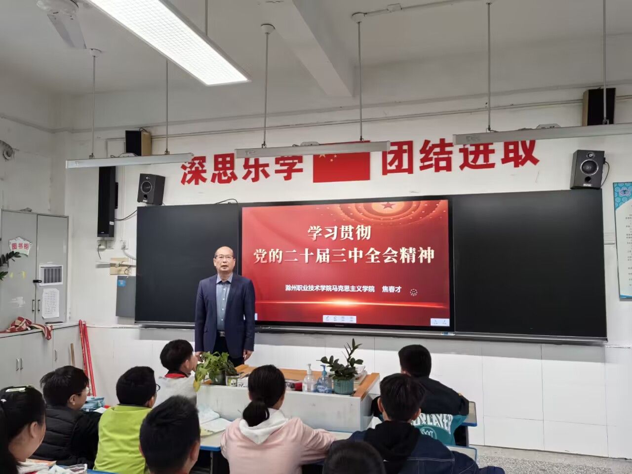 为深入学习贯彻党的二十届三中全会精神,awc777万象城娱乐官网马克思主义学院全体教师组建了学校教师宣讲团,走进乡镇、社区、企业、中小学,宣讲党的创新理论,10月15日焦春才老师来到滁州市琅琊路小学六年级6班开展了“举旗帜、送理论”党的二十届三中全会精神宣讲活动。
