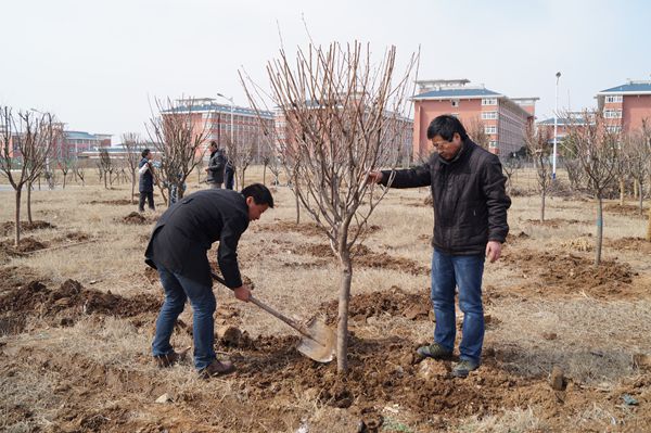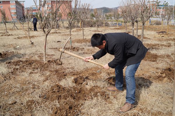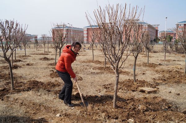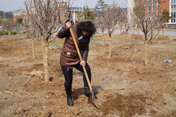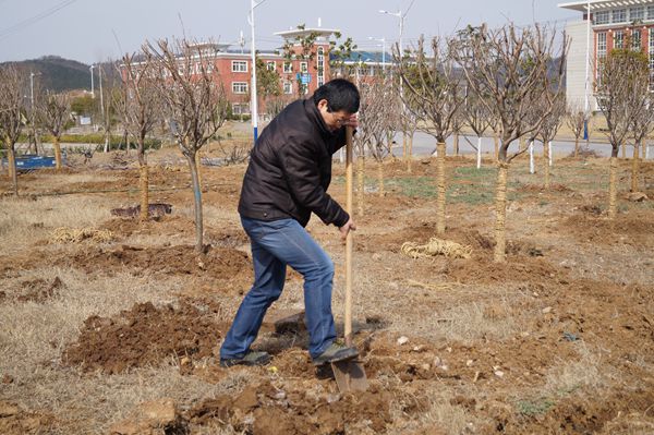 迎着春日暖阳,老师们抡起铁镐、踩下铁锹,在绿化师傅的指导下按规格挖好了树洞,亲手种上了一株株樱树。劳动者们看着自己辛勤的劳动成果,就仿佛看见了将来绿意浓浓、郁郁葱葱的成片树林,期待着这绿荫能够成为职院一道美丽的风景,带来生机盎然——春的期盼。