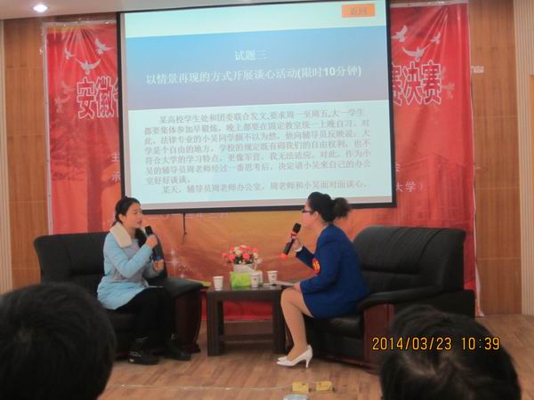 2013年3月21至23日,为期三天的全省高校辅导员职业技能竞赛决赛在安徽师范大学落下帷幕。此次大赛由安徽省教育厅主办,安徽省高校辅导员培训与研修基地(安徽师范大学)承办。参加比赛的24所高校的30名辅导员全是经过合肥、皖北、皖南三个片区比赛选拔出的优秀选手。我院机电系辅导员谢丽丽老师代表学院参加了比赛,思政部李爱红老师作为指导教师全程辅导。