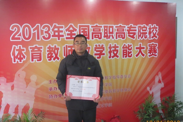 2013年12月19-21日,在杭州举行为期三天的全国高职高专院校体育教师教学技能大赛,awc777万象城娱乐官网基础部教师王电海通过体能、急救、主项、副项、教案设计、微课程等多项比赛,充分展示自己的专业技能和全面发展的素质,一路不畏强手,顽强拼搏,最终获得二等奖好成绩。