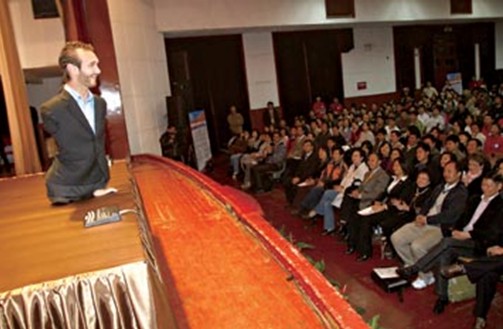 尼克·胡哲(Nick Vujicic)1982年12月4日生于澳大利亚墨尔本,现居住在美国加利福尼亚州。曾获会计和财务规划的双学位。他是一位知名的励志演说家,也是一家非政府机构“没有四肢的生命”组织创办人兼行政总裁。他天生没有四肢,但勇于面对身体残障,创造了生命的奇迹。在中国红十字会和北京思尔豪国际的邀请下,尼克曾于2008年和2009年访问中国。他曾在清华大学,首都师范大学、复旦大学和中南财经政法大学发表演说。同时,他也到过四川向地震灾区孤儿及受灾青少年发表演说。他触动了许多人的心灵,也改变了许多人的生命。