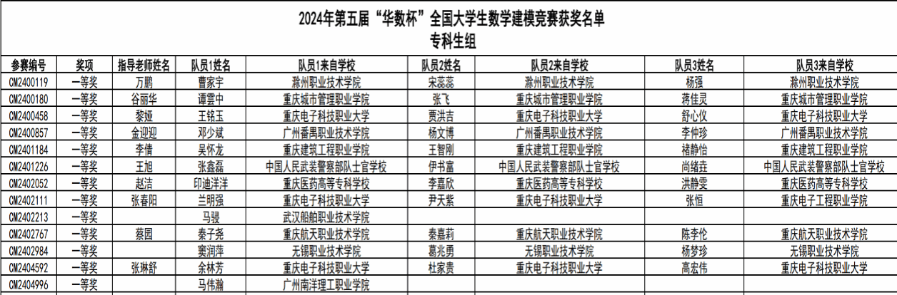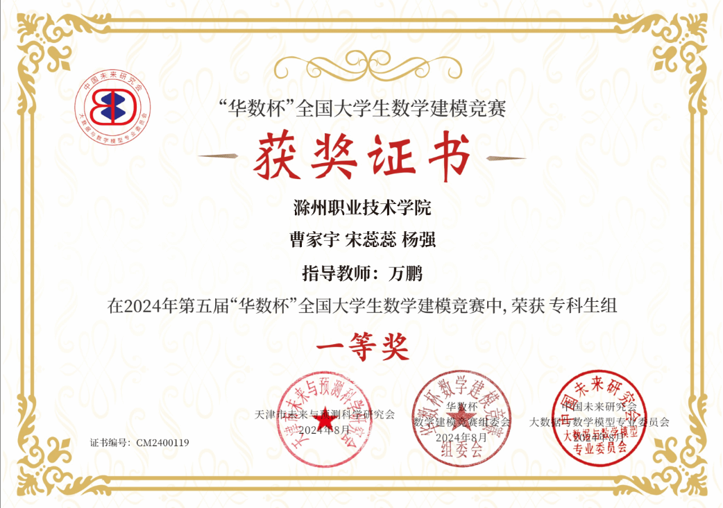 近日,从第五届“华数杯”全国大学生数学建模竞赛传来喜讯,在基础教学部万鹏老师的指导下,awc官网电气工程学院曹家宇、杨强同学和食品与环境工程学院宋蕊蕊同学组成的跨学科参赛队伍荣获专科组一等奖。此次竞赛于2024年8月4日至7日在线上举行,吸引了来自全国724所高校的4129支队伍参与,竞争异常激烈。