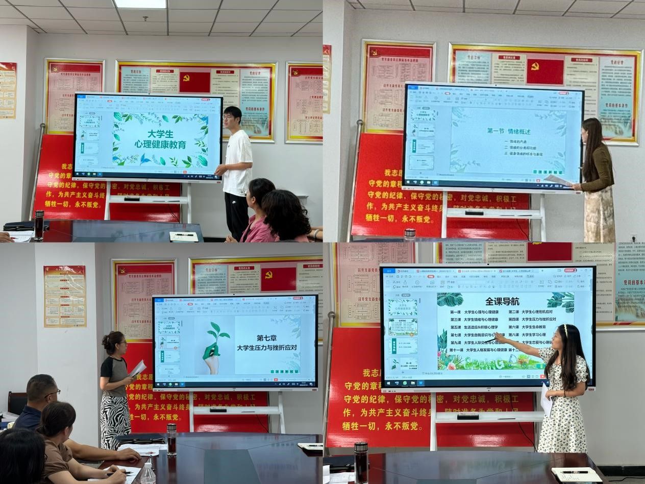 随后,教研室专职教师疏琪琪、张宇、胡悦、杨画围绕新教材,分别就导论、心理危机与干预、情绪、压力与挫折四个重点章节进行教学说课,教学设计包括案例、活动、视频、心理测量问卷等形式,旨在引导学生树立健康心理,积极拥抱幸福人生。说课结束后,与会的各位老师展开了深入研讨交流,就如何更好地建设课程抒发了自己的见解,现场气氛热烈。