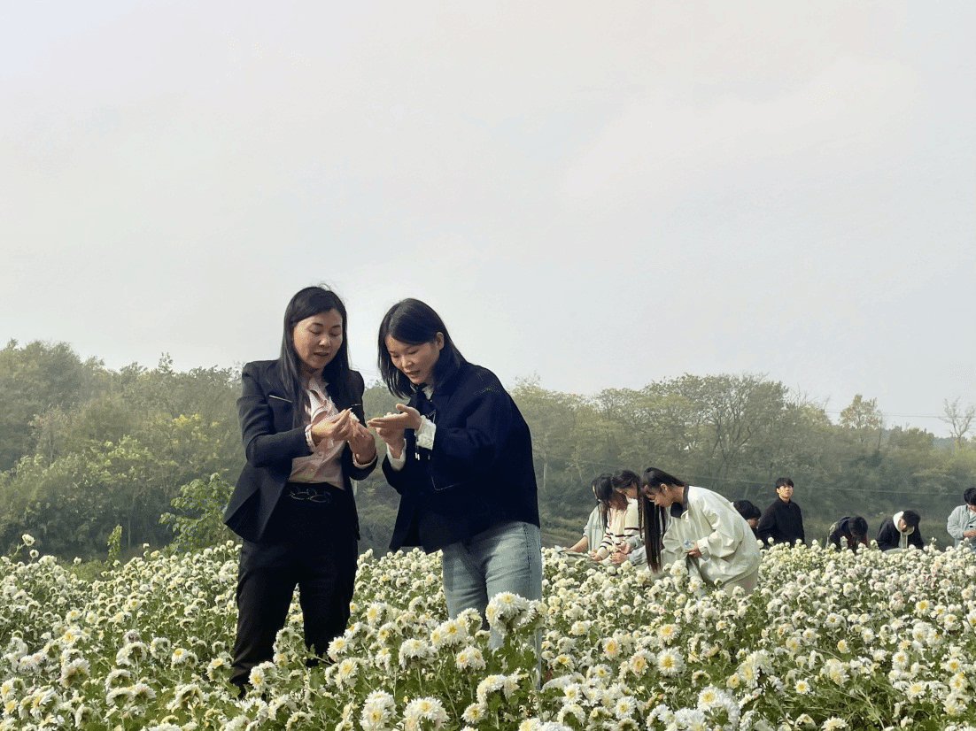 滁菊名列中国“四大药菊”之首,在滁州已有近千年栽培历史,具有清热、解毒、明目、活血等药用及保健功效,是滁州市花、城市名片。“采滁菊时,要挑选枝头完全盛开的花朵,用食指和中指拖住花蒂,拇指轻轻按住花心,往上轻提,一朵完整的菊花就采摘好了。”龚建国、刘晓翠耐心地讲解、示范着,学生们按照劳模们的指导,小心翼翼地采摘着滁菊。采摘过程中刘晓翠还不忘向同学们介绍:“滁菊中含有十多种微量元素,其中硒含量每公斤50微克,比其他菊花高8-40倍,药用价值很高,具有增强抵抗力,美容养颜的功能。”此次校外劳动实践活动不仅让同学们亲身体验了采摘的乐趣,同时两位劳模的言传身教,也让他们深刻体会到了劳动教育的价值和意义。