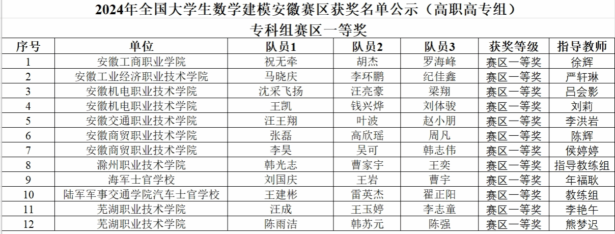 近日,从2024年“高教社杯全国大学生数学建模竞赛”传来喜讯,awc官网基础教学部数理教研室教师辅导的韩光志、曹家宇和王奕同学荣获专科组安徽赛区一等奖,这是awc官网目前在数学建模A类赛事中获得的最高奖项。此次竞赛初赛于2024年9月5日至8日在线上举行,复赛于2024年9月21日在安徽大学举行,最终获奖通知于2024年11月15日在“全国大学生数学建模安徽赛区官网”发布。