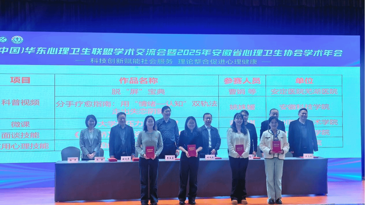 会议期间,心理卫生协会举办了第二届安徽省心理科普微课与实践技能大赛颁奖仪式。该大赛共设置了心理科普视频、心理微课、心理咨询及心理治疗面谈技能、应用心理案例四个分赛道。基础教学部教师疏琪琪凭借作品《大学生压力及其应对》荣获“微课专业组”一等奖。