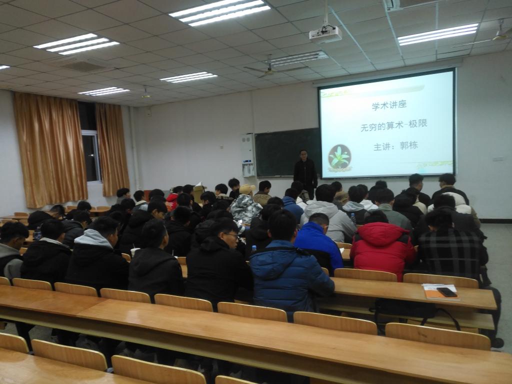 2019年11月27日晚上18:40,郭栋副教授在南阶103教室举办了“无穷的算术-极限”的学术讲座。全校对极限来源感兴趣的90多名同学聆听了此次讲座。