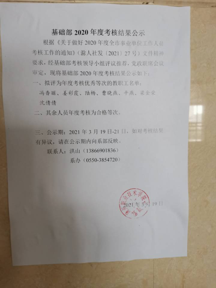 基础教学部2020年度考核结果公示