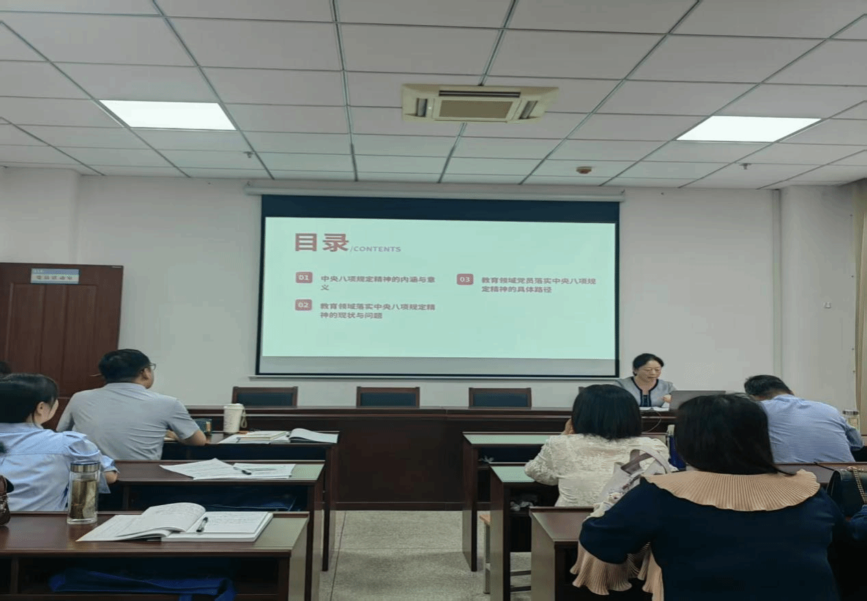 薛天飞首先解读了中央八项规定精神的内涵,阐明了深入贯彻中央八项规定精神学习教育的重大意义。在分析教育领域在落实中央八项规定精神过程中可能存在的一些问题时,她要求全体党员对标反思、引以为戒。