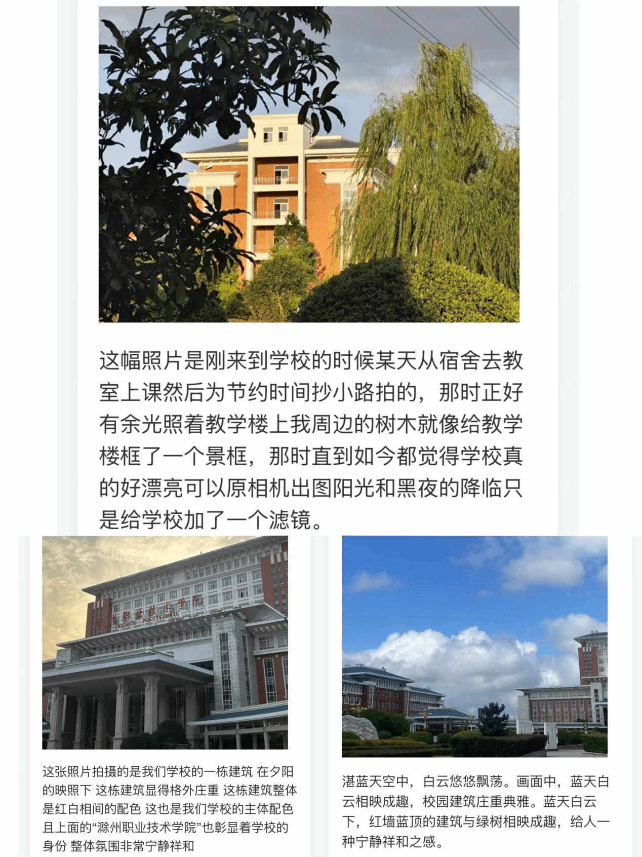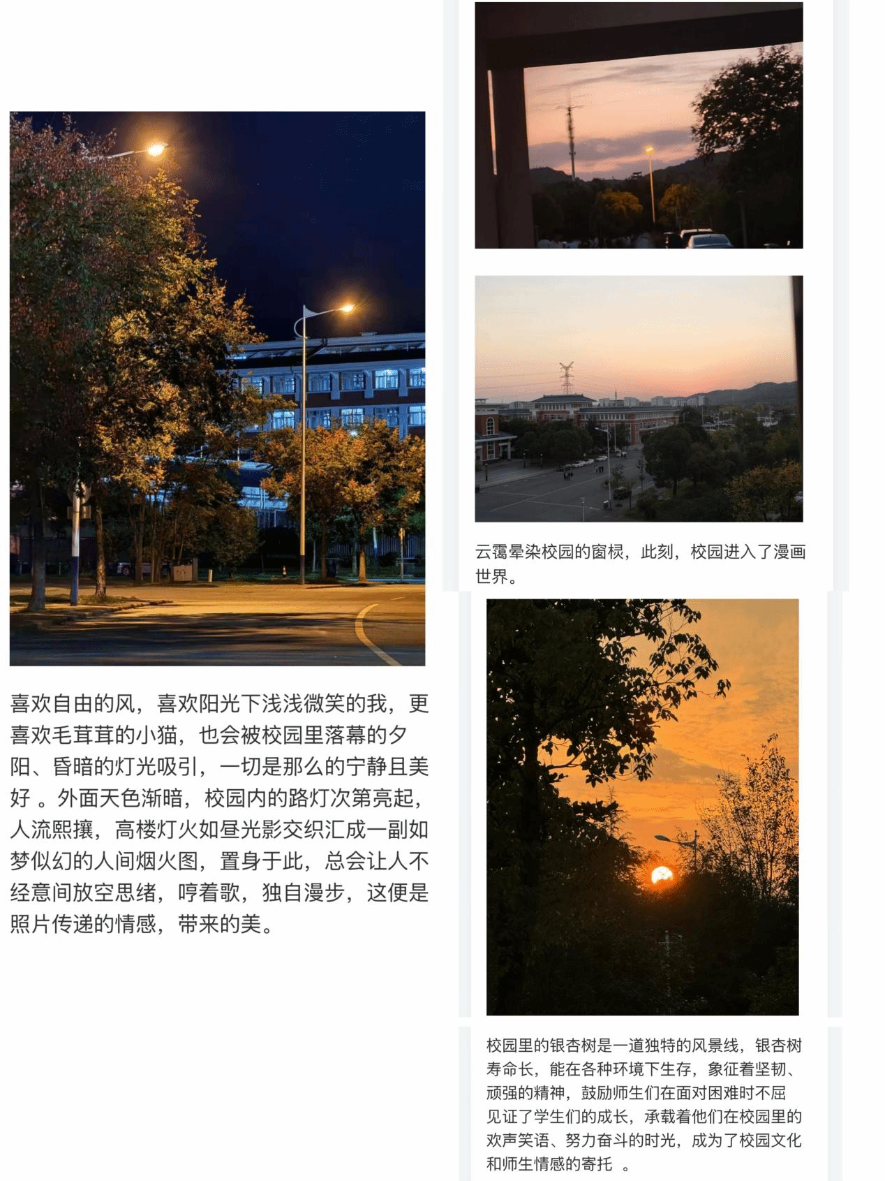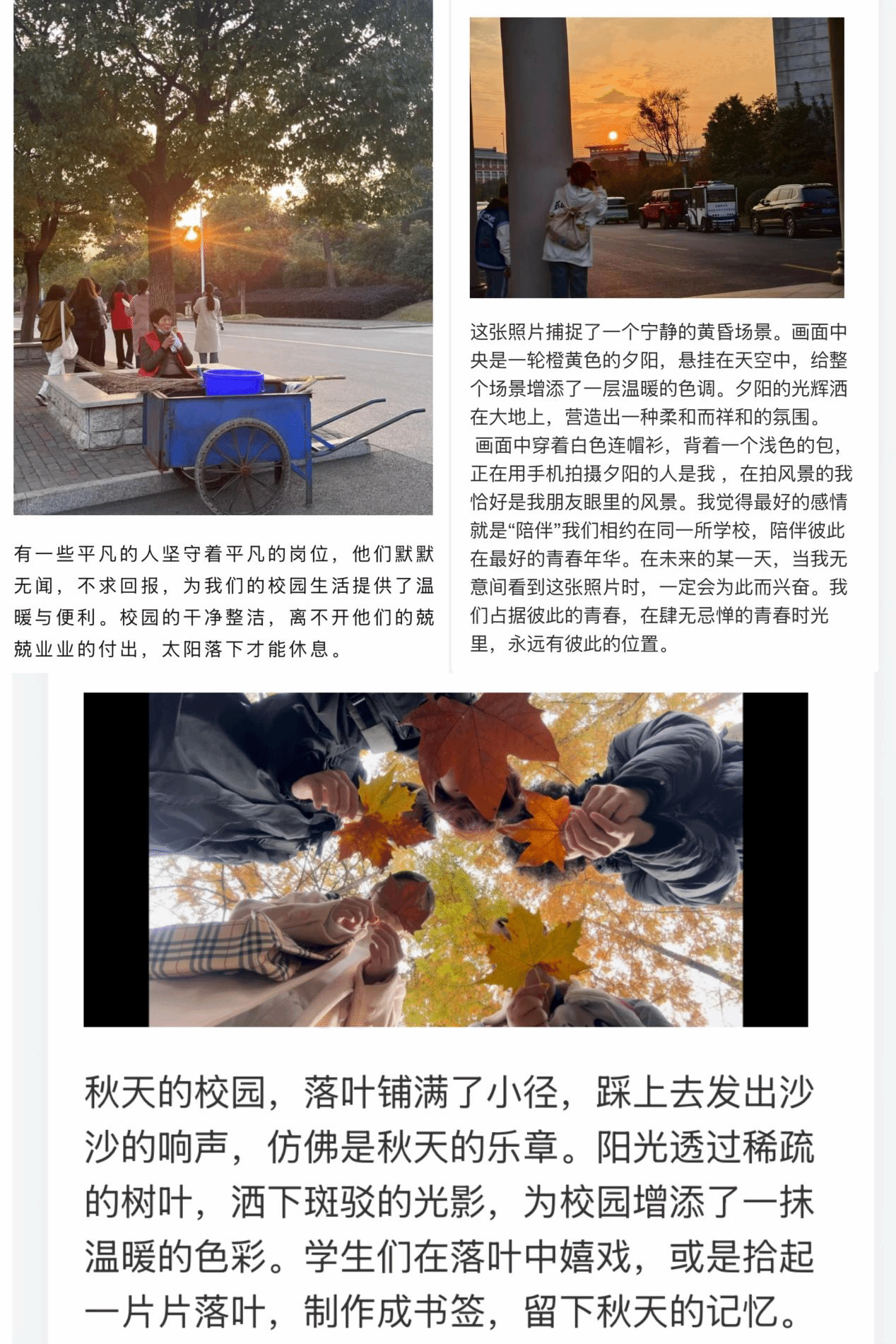 陈鹤琴先生所言“大自然、大社会都是活教材”。在实践课上,同学们穿梭于校园中,从校园的历史文化印记到波光粼粼的湖泊、风景如画的花园角落,每一处都隐藏着意想不到的惊喜。有的同学关注了很多日常中被忽略的事物,收集了树叶、鲜花等制作成创意作品;有的同学用相机记录下鲜花盛开时的灿烂笑容,留下了珍贵的记忆;有的同学看到了劳动者在校园内辛勤工作的瞬间……这些美好如同一股股暖流,温暖着他们的心灵,激发着他们内心的正能量。