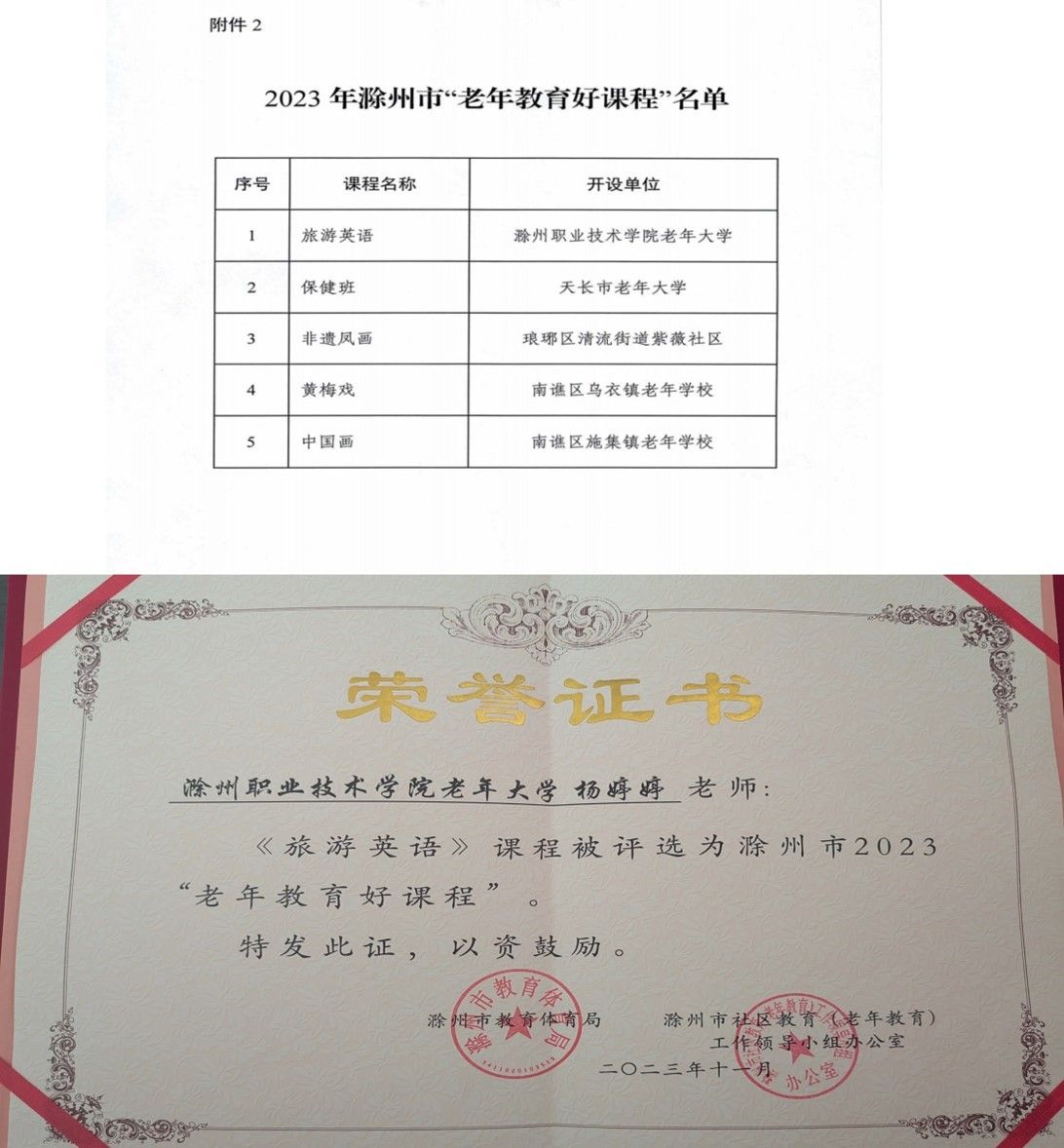 为推动老年教育课程资源建设,打造一批老年教育特色课程,滁州市教育体育局、滁州市社区教育(老年教育)工作领导小组办公室开展了滁州市“老年教育好课程”评选活动,参评对象包括全市各级各类老年学校(大学)开设的课程及有关单位或个人筹备建设较为成熟的老年教育课程。经专家评审,awc官网基础教学部外语教研室杨婷婷老师申报的《旅游英语》课程在众多优秀作品中脱颖而出,获评滁州市2023“老年教育好课程”。该课程选题适用性强,符合老年教育特点,教学设计启发引导性强,教学内容完整,技术、配音规范,有良好的应用效果预期和推广价值。