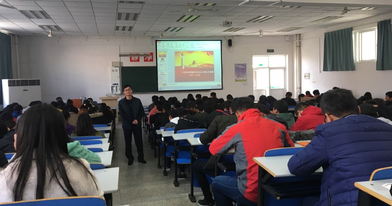 11月20日,思政部汪立超副教授为学校部分学生开展思政理论讲座,汪立超副教授主讲的题目是“大学生如何践行社会主义核心价值观”。讲座由胡颖颖副教授主持,学校师生200余名在北阶102聆听了讲座。