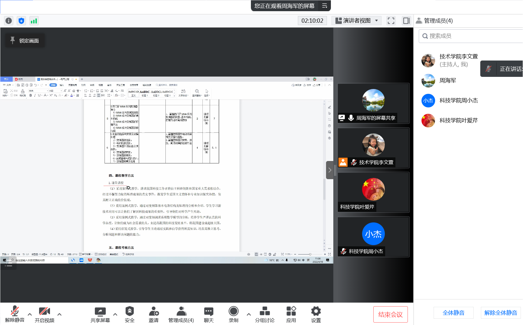 首先专业负责人李文萱介绍了外聘教师滁州学院周海军的基本情况。科技学院专业负责人周小杰老师介绍了科技学院该课程的课程授课情况和实践学时的安排情况。周海军老师介绍了自己授课的情况,并对实践内容的考核提出了自己的想法。科技学院叶爱芹老师给与了不少的肯定,双方就课程设置、课程教学内容选择等方面交换了意见。