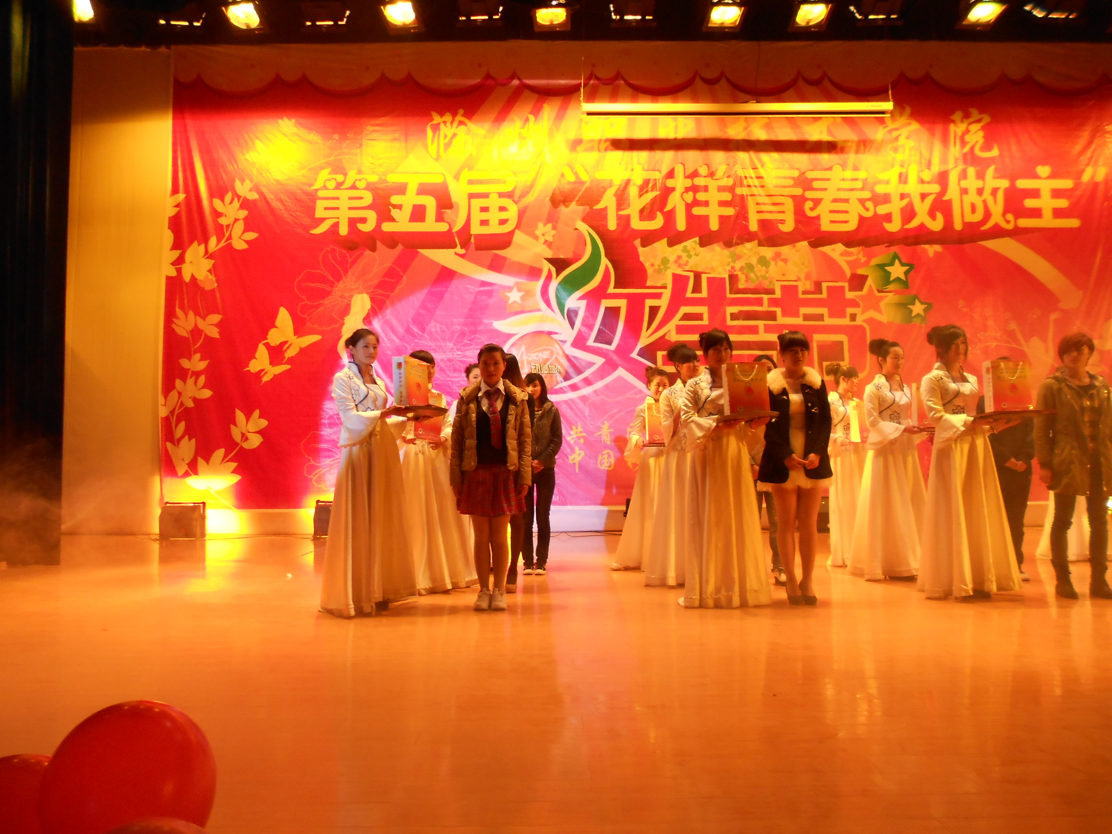 春佛三月繁似锦,巾帼笑靥迎新节。2013年3月27日,我院第五届女生节闭幕颁奖晚会在我院新大礼堂隆重开幕。在晚会颁奖环节中,我系在拔河比赛中获得三等奖,我系圣宝露同学在跳绳比赛中获得三等奖、胡文娜同学获得才艺大赛一等奖。