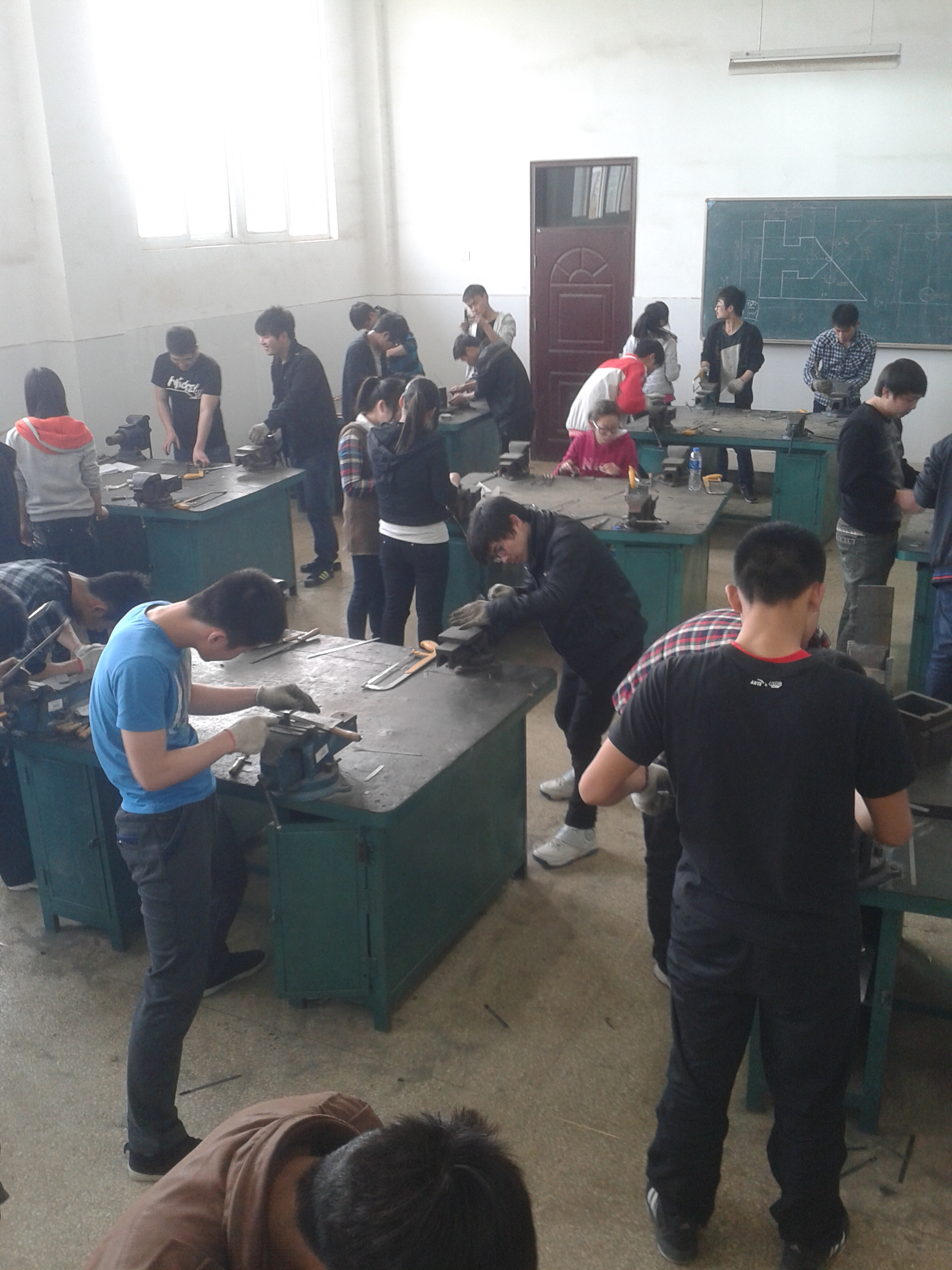 2013年3月18日12级电气自动化班初次进行为期4周的钳工实训,同学们显得格外的兴奋,情绪饱满。实训楼2206教室里,钳工实习中心小左老师首先声明实习纪律及应该注意的事项,接着每天他都给我们先画图讲解再部署任务。同学们看着黑板上看似简单的图样,兴致勃勃地开始了工作。可做起来并不那么容易,对工件的尺寸要求和精密程度都要控制在误差范围内,否则再漂亮的工件都是废品。