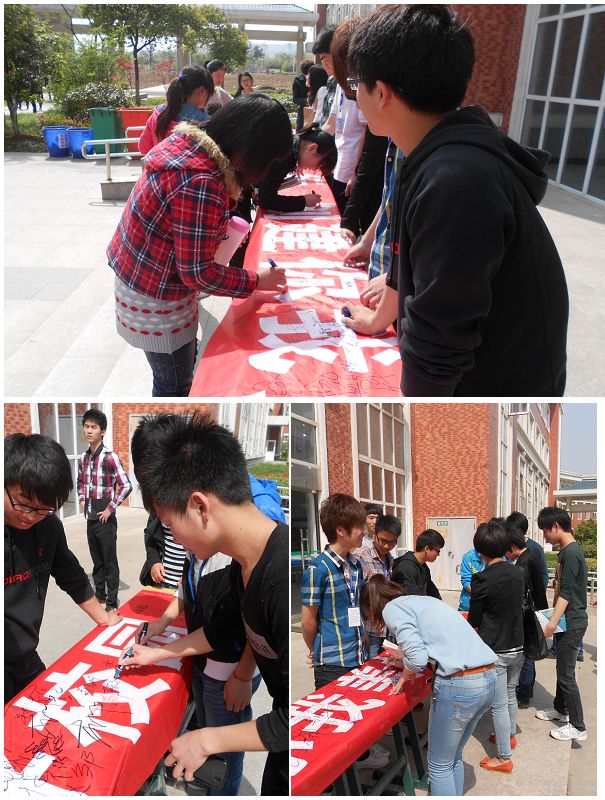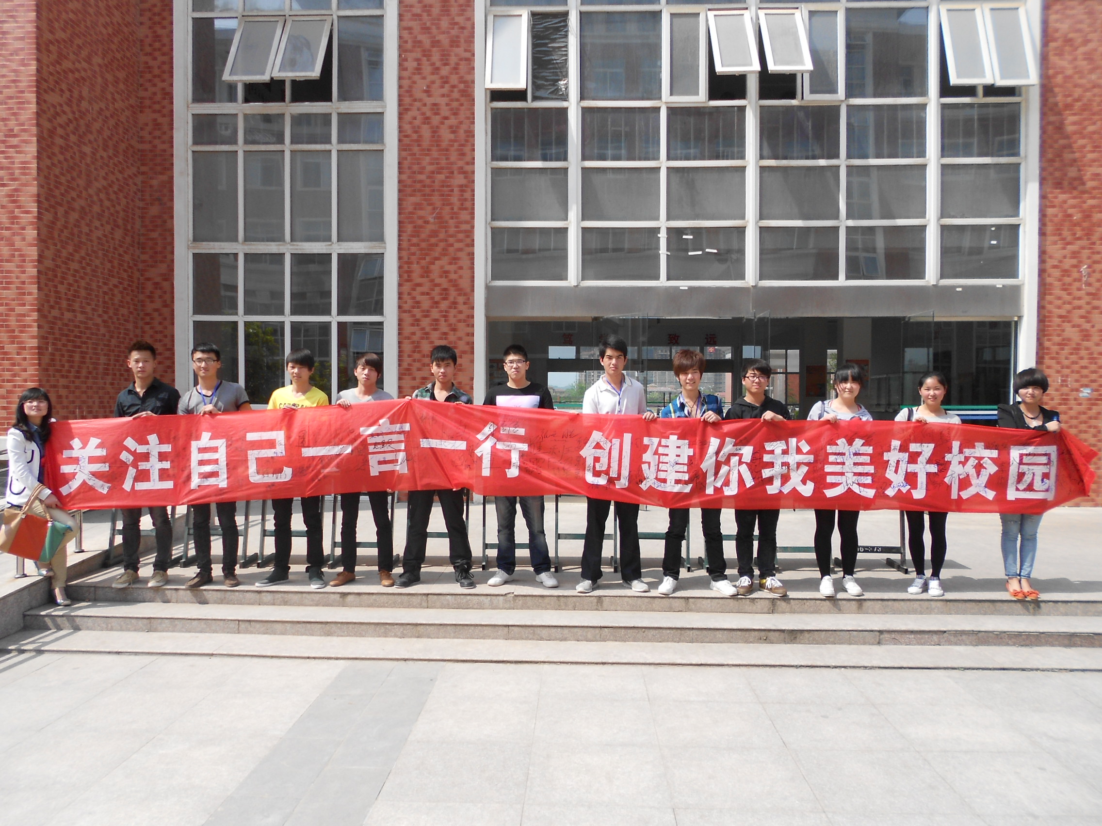 2013年4月26日中午,在5号楼前,我系开展了一场校风与我主题签名活动。参加本次活动的人员来自各部的学生会成员及各班的同学。
