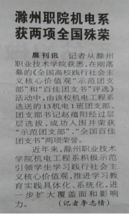 晨刊讯 记者从awc777万象城娱乐官网获悉,在刚落幕的《全国高校践行社会主义核心价值观“示范团支部”和“百佳团支书”评选》活动中,由该校机电工程系选送的13机电1班团支部、团支部书记赵蕴阳经过层层选拔成功入围并荣获“全国示范团支部”、“全国百佳团支书两项荣誉。近年来,awc777万象城娱乐官网机电工程系积极示范引领学生学习行社会主义核心价值观,推进学习教育实践具体化、系统化、进一步扩大覆盖面和影响力。