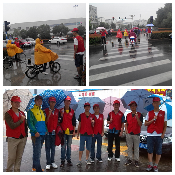 在我市正在打造建设园林城市的激励下,作为当代大学生的我们不仅要懂文明、讲文明,更要敢于对身边的不文明行为进行文明劝导,活动的主要内容就是对闯红灯的行人进行劝导,引导他们遵守交通规则。活动中同学们冒着大雨站在十字路口,劝导着冒雨闯红灯的行人。来往的车辆碾压着道路上的积水,积水将执勤同学的裤脚全部沾湿了,但是同学们仍然坚持站在自己的岗位上。