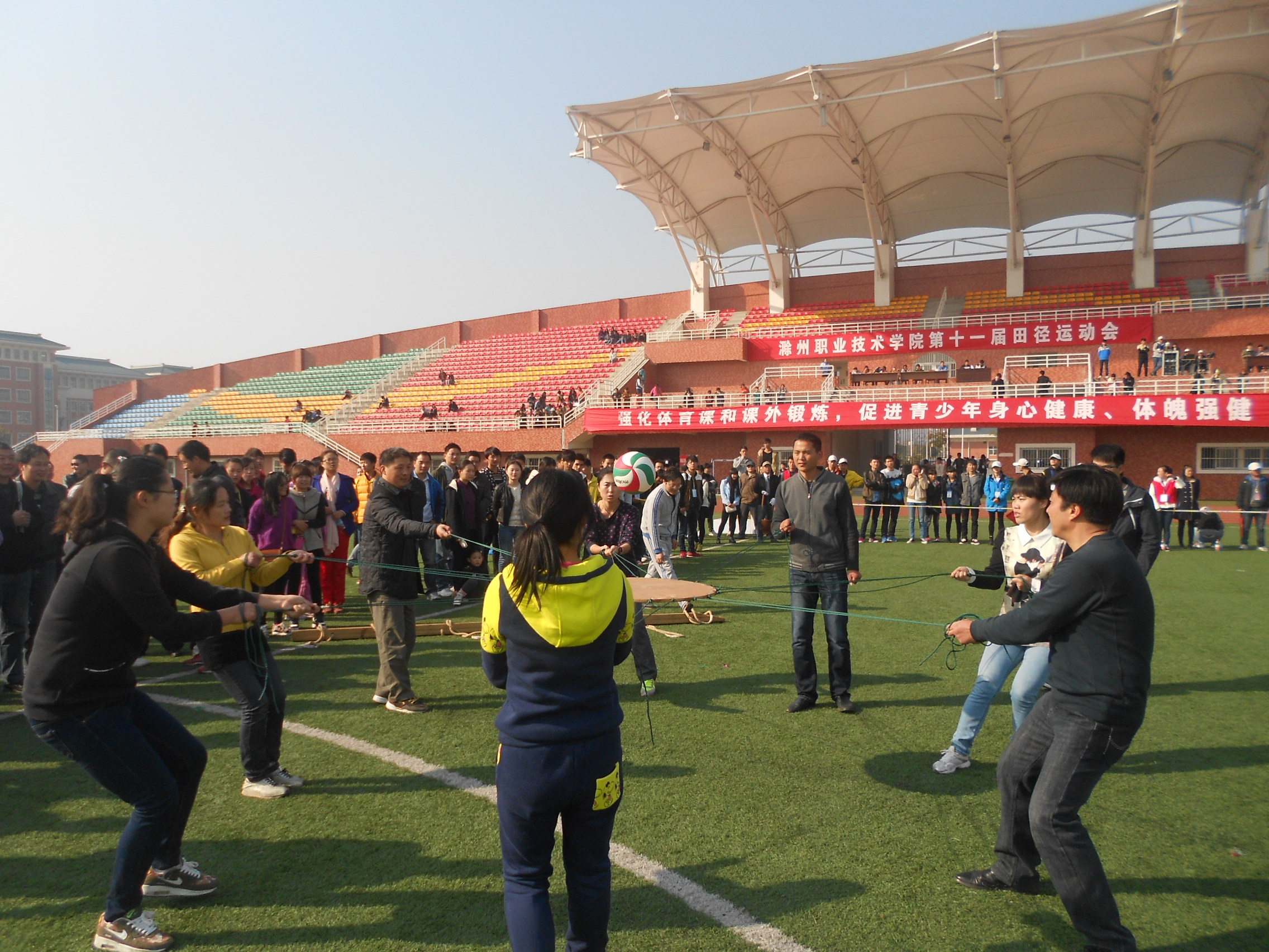 11月14日,awc777万象城娱乐官网于新校区操场上举办了第十一届校运动会之教师趣味运动会。机电系各教师参加了本次活动。