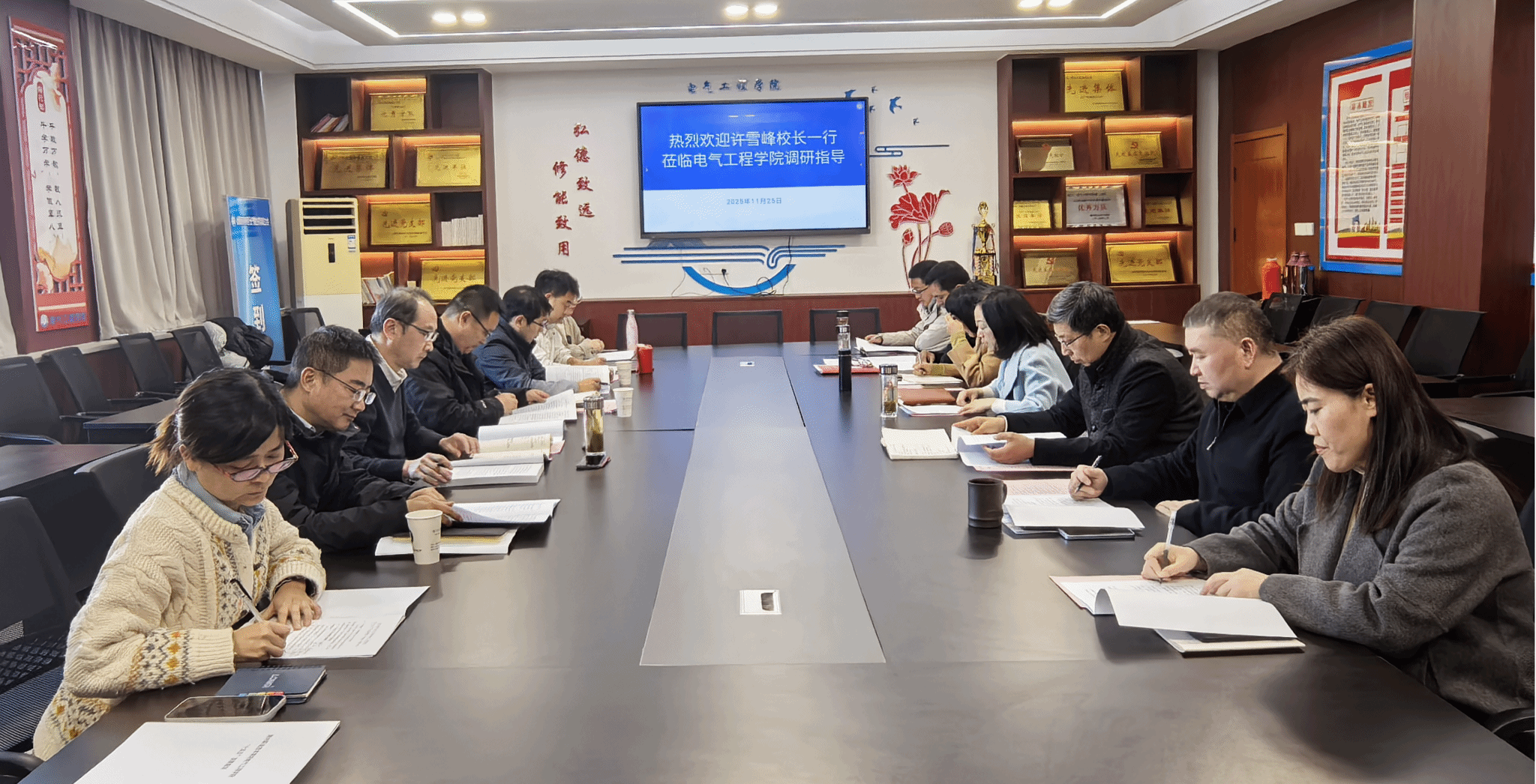 11月25 日下午,校党委副书记、校长许雪峰深入电气工程学院指导“十五五”规划工作,教务处处长唐义武、质量管理中心主任吴昌雨、办公室副主任何凯陪同调研。电气工程学院班子成员和系主任、博士教师参加会议,会议由学院党总支书记薛天飞主持。