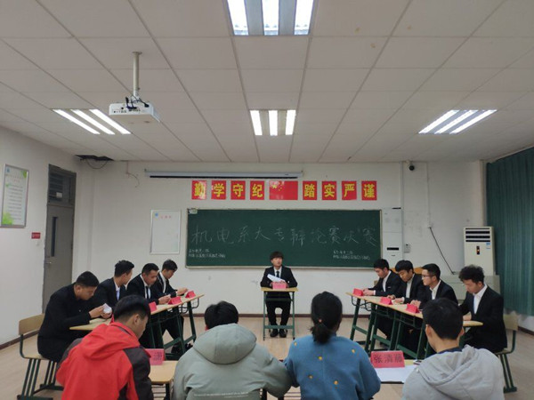 本次辩论赛共有7支代表队,在初赛中共有4支队伍成功进入复赛;经过激烈的角逐,18机电二班和18机电三班成功晋级决赛。决赛的辨题是“以成败论英雄是否可取”。18机电二班为正方:认为以成败论英雄是可取的:;18机电三班为反方:认为以成败论英雄是不可取的。比赛过程中八位辩手旁征博引、妙语连珠,结合理论与现实充分论证了成功与英雄之间的问题,双方针锋相对互不相让,为大家呈现了一场有理有据的精彩辩论。经过立论陈词、攻辩阶段、攻辩小结、自由辩和总结陈词五个环节的激战,最终18机电二班代表队获得 本次辩论赛的冠军,蒋亮光同学获得最佳辨手。