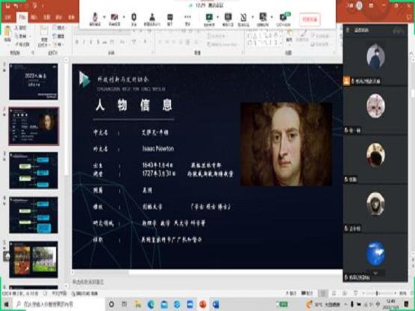 为了丰富校园文化生活,提高学生们的艺术积极性,引导学生们积极开展文化活动, 10月8日,我院科技创新与发明协会在腾讯会议上成功举办了“名人故事会之牛顿”主题学习会。