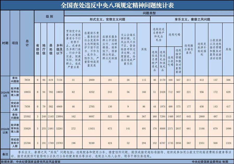 2024年3月全国查处违反中央八项规定精神问题7859起